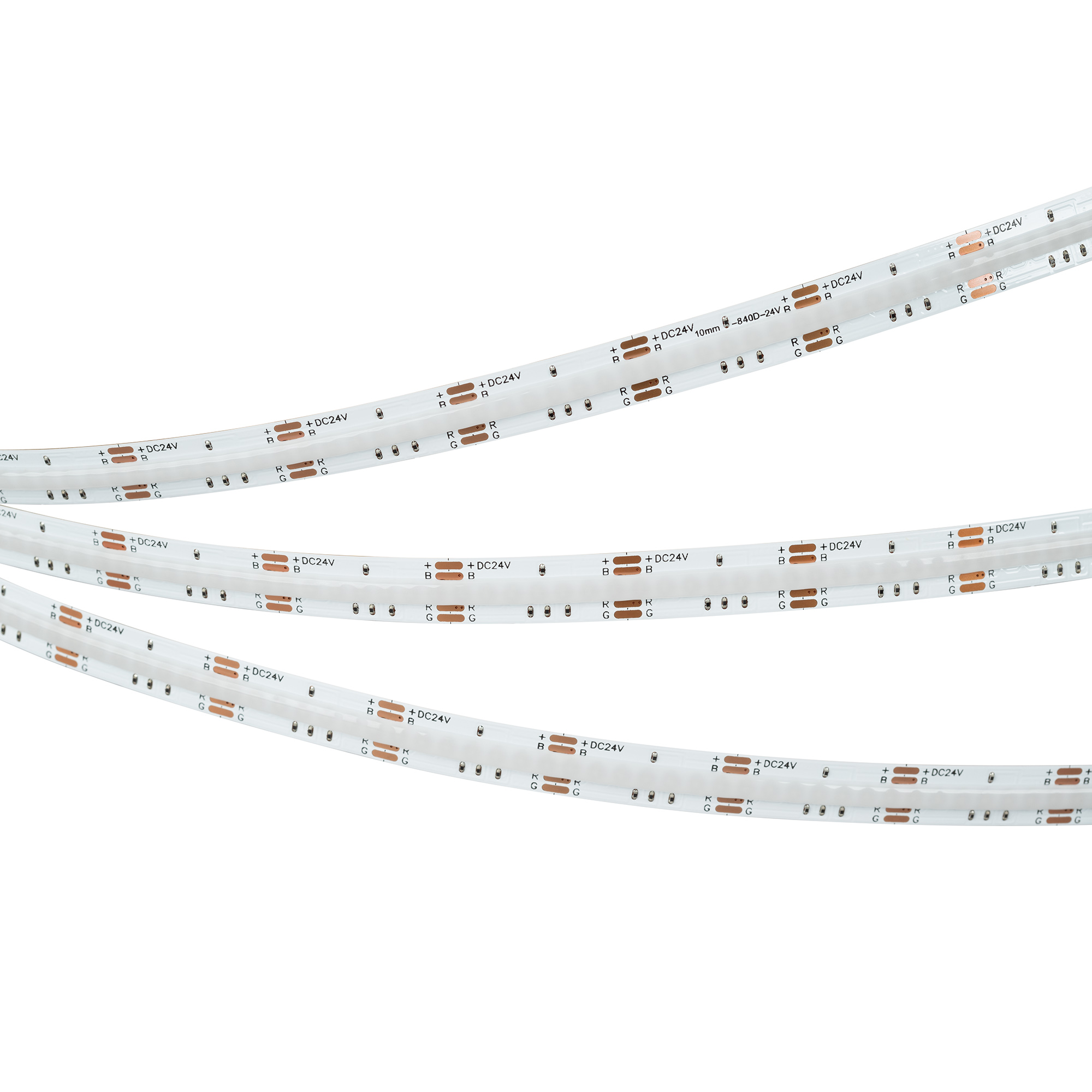 Мультицветная светодиодная лента сплошного свечения COB серии X840. Светодиоды CSP, 840 шт/м, белая плата шириной 10 мм, скотч 3M. Цвет RGB, угол 160°. Питание 24 В, мощность 16 Вт/м (80 Вт на 5 м). Размеры 5000x10x1.5 мм. Мин. отрезок 25 мм. Цена за 1 м. Обязательна установка на профиль.