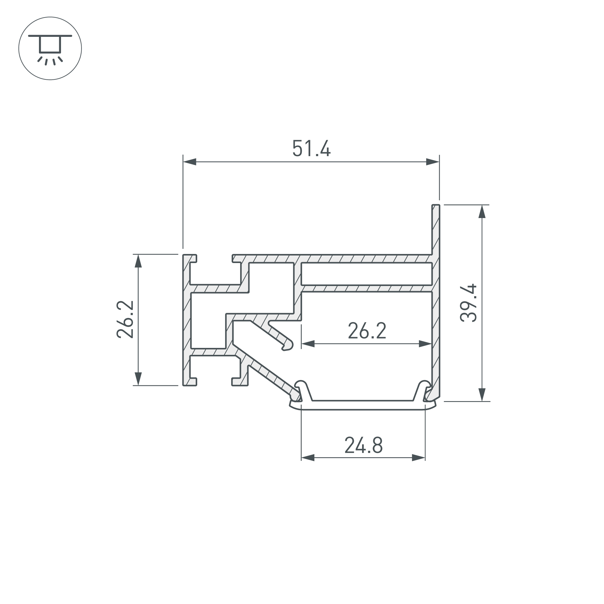 Габаритные размеры профиля составляют 2000 мм в длину, 51,4 мм в ширину и 29,5 мм в высоту. Площадка для установки светодиодных лент позволяет использовать ленту шириной до 26 мм и мощностью до 45 Вт/м. Это обеспечивает гибкость в выборе светодиодных лент и создает потрясающие световые решения. Гарпунная система крепления натяжного ПВХ потолка.