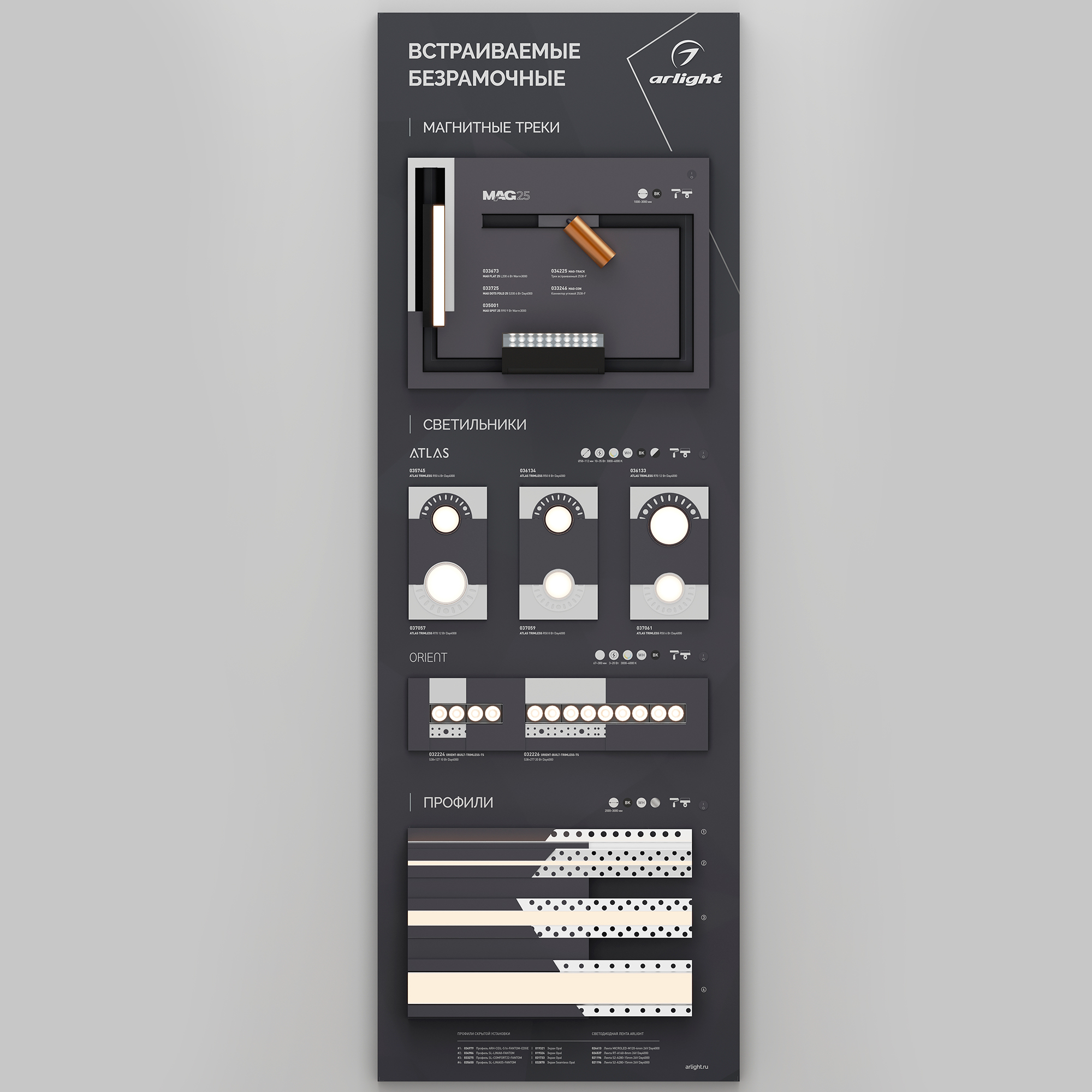 Стенд Безрамочное освещение. Включает в себя магнитные треки, светильники ATLAS, ORIENT, профили для установки под шпаклевку.