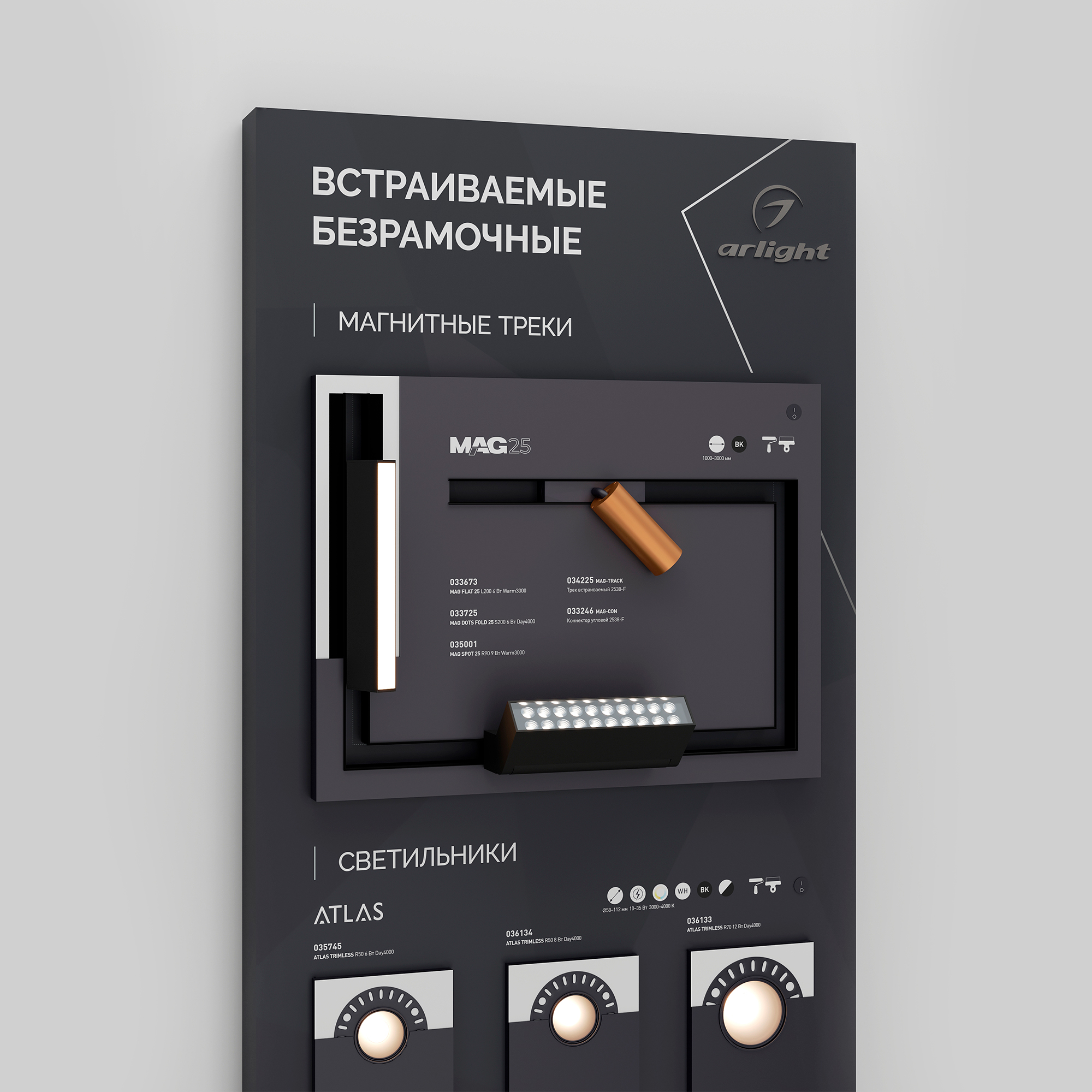 Стенд включает в себя магнитные треки, светильники ATLAS, ORIENT, профили для установки под шпаклевку.