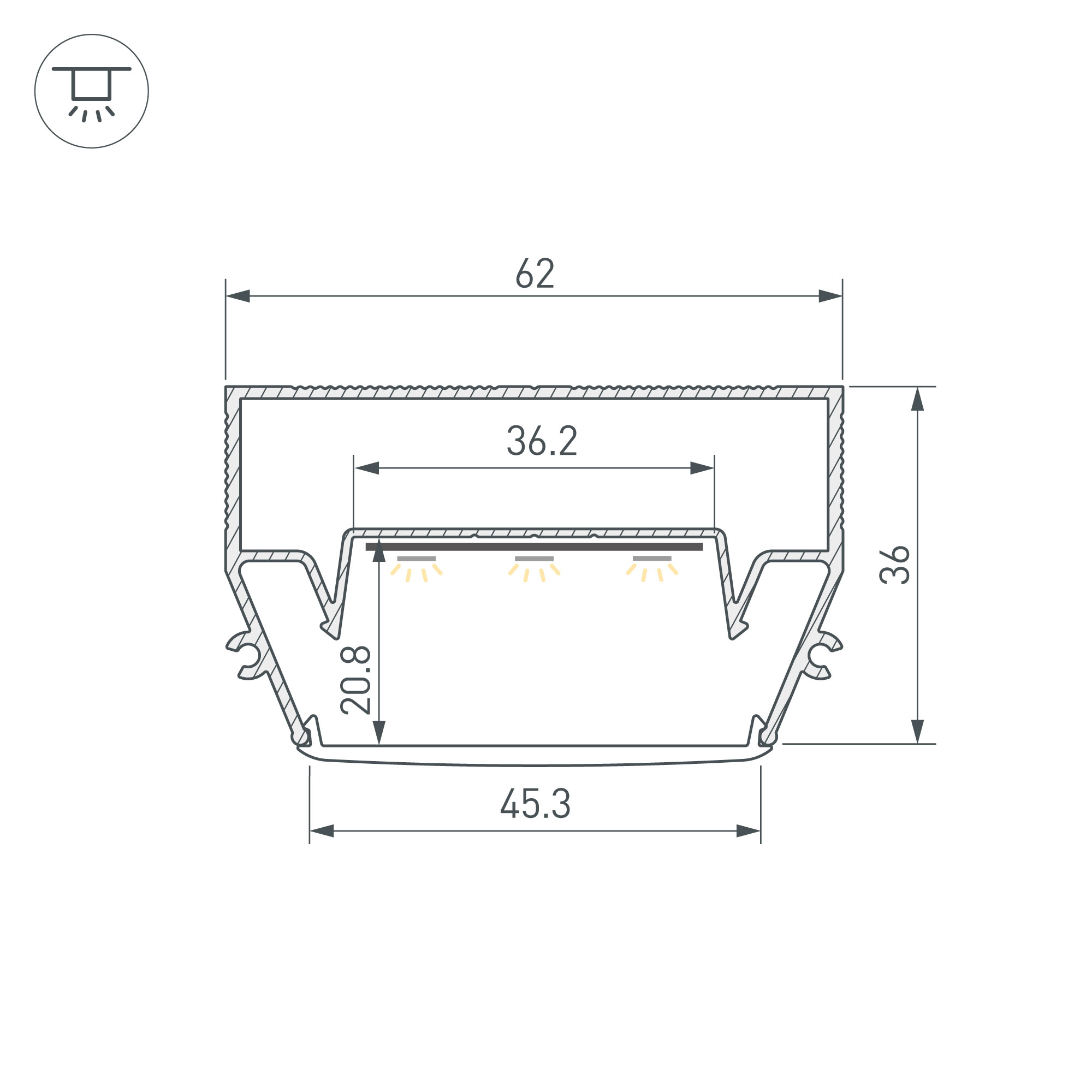 Габаритные размеры профиля составляют 2000 мм в длину, 62 мм в ширину и 36 мм в высоту. Площадка для установки светодиодных лент позволяет использовать ленту шириной до 36,2 мм и мощностью до 60 Вт/м. Это обеспечивает гибкость в выборе светодиодных лент и создает потрясающие световые решения.
