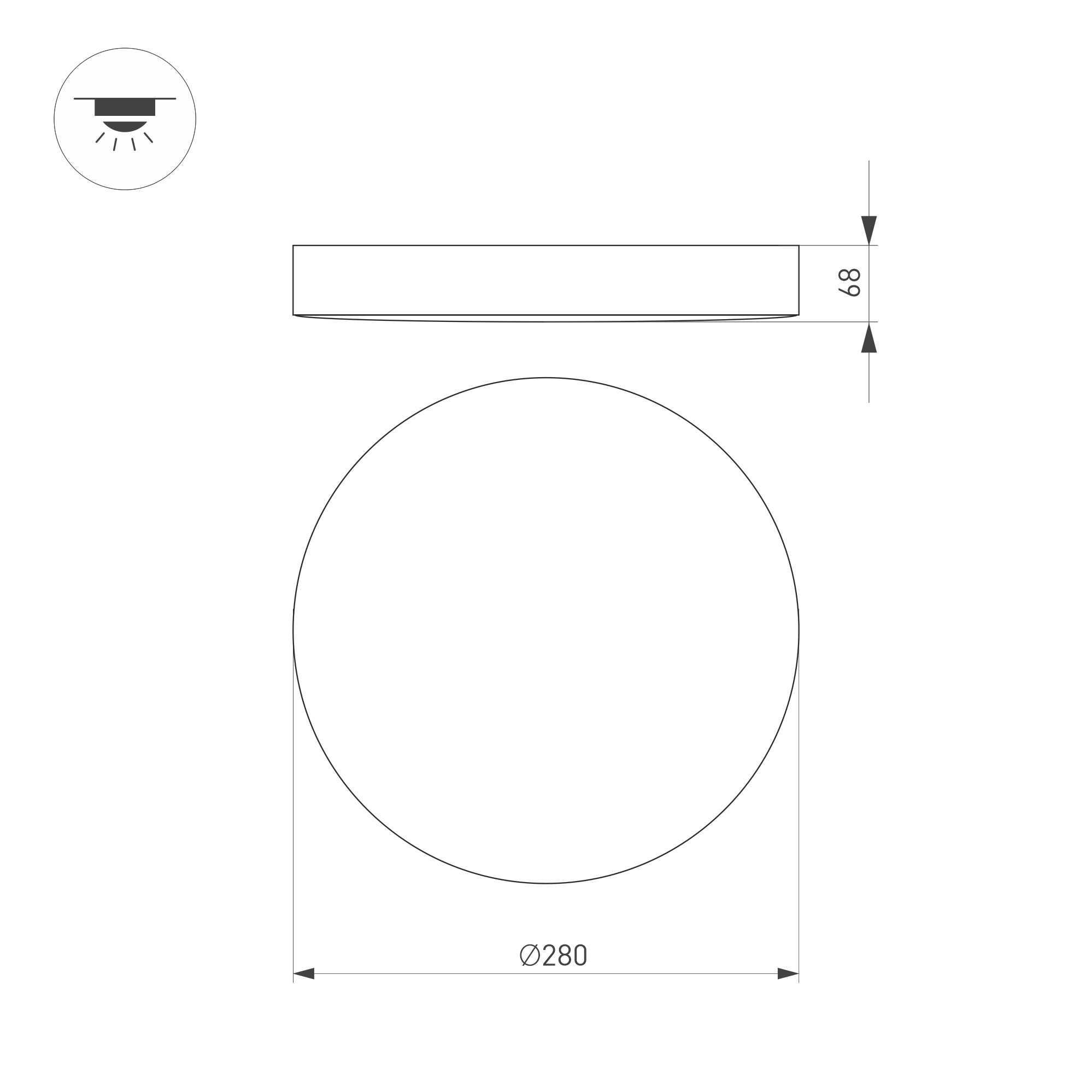Светодиодный светильник с микроволновым датчиком движения, с изменяемой мощностью и цветовой температурой. Мощность полная 10-15 Вт (переключается), св. поток 1150-1600 лм, 105 лм/Вт, теплый 3000 K, дневной 4000K, белый 5700K (переключается), CRI>80, угол 110°, напряжение питания 230 В. Черный круглый корпус из пластика, экран PC, степень защиты IP54. Размер: длина 280 мм, ширина 280 мм, высота 68 мм. Монтаж накладной. Драйвер 48-83 В, 175/250 мА, пульсация <5%.