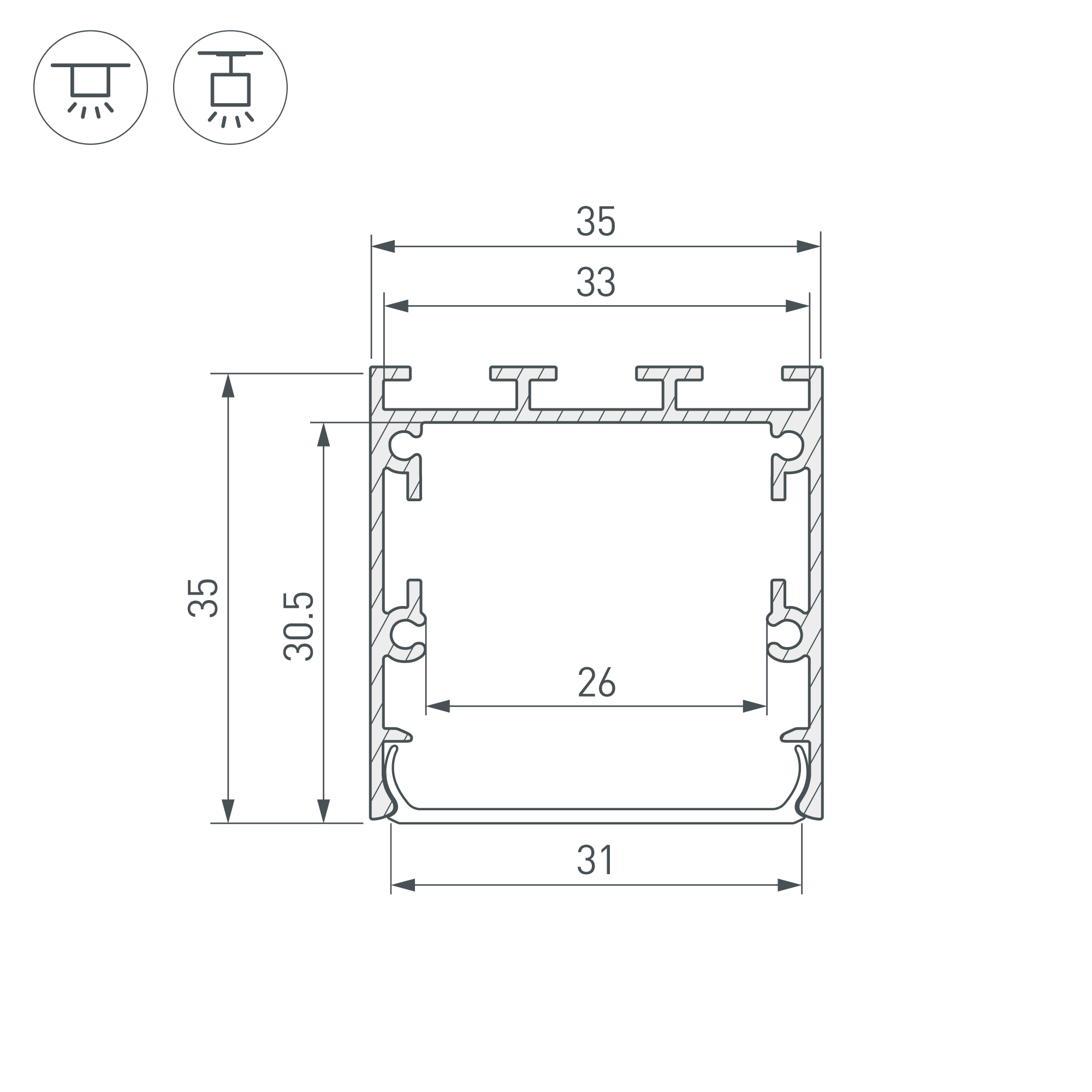 Габаритные размеры профиля составляют 3000 мм в длину, 35 мм в ширину и 35,5 мм в высоту. Площадка для установки светодиодных лент позволяет использовать ленту шириной до 26 мм и мощностью до 37 Вт/м. Это обеспечивает гибкость в выборе светодиодных лент и создает потрясающие световые решения.
