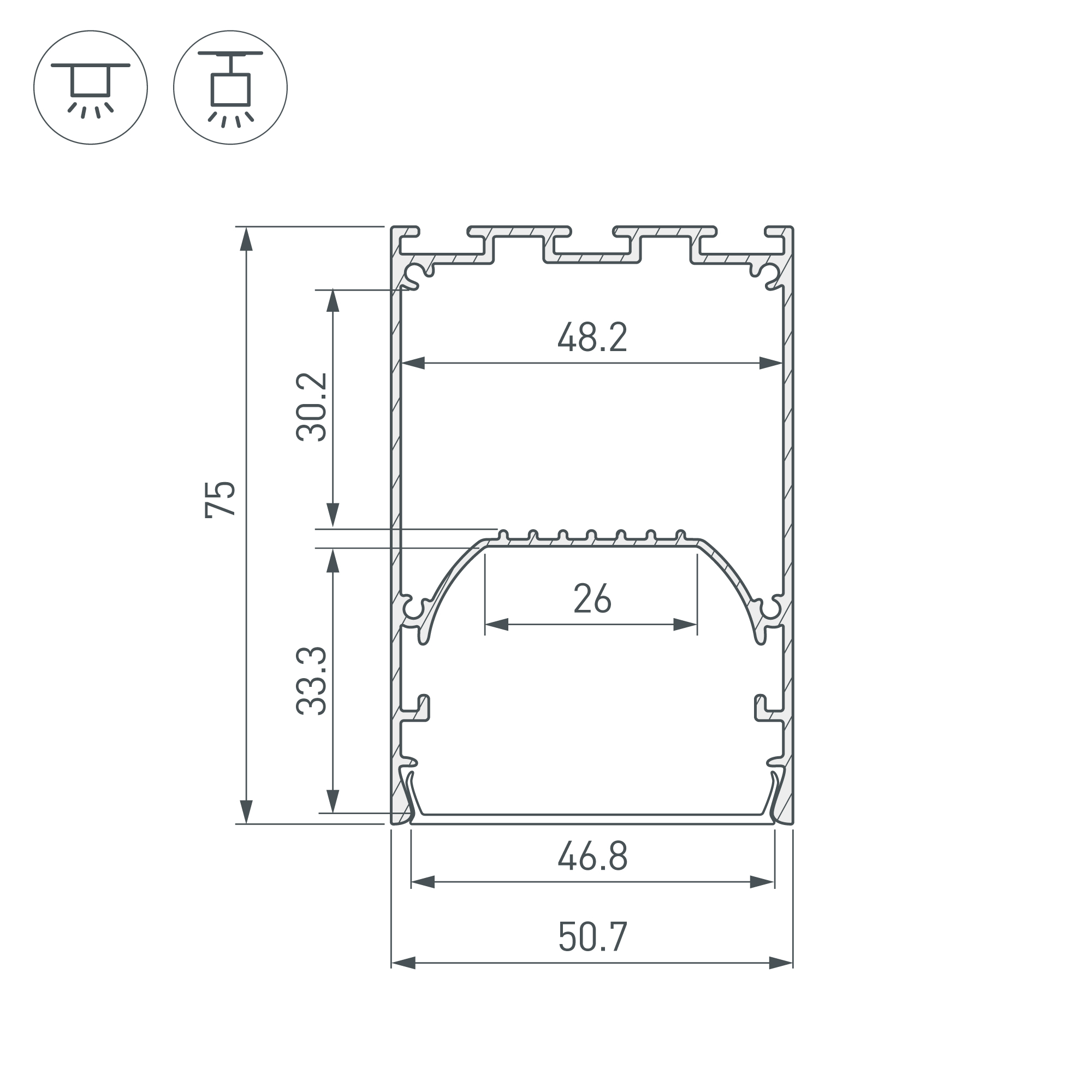 Габаритные размеры профиля составляют 2000 мм в длину, 50,7 мм в ширину и 75 мм в высоту. Площадка для установки светодиодных лент позволяет использовать ленту шириной до 26 мм и мощностью до 65 Вт/м. Это обеспечивает гибкость в выборе светодиодных лент и создает потрясающие световые решения.