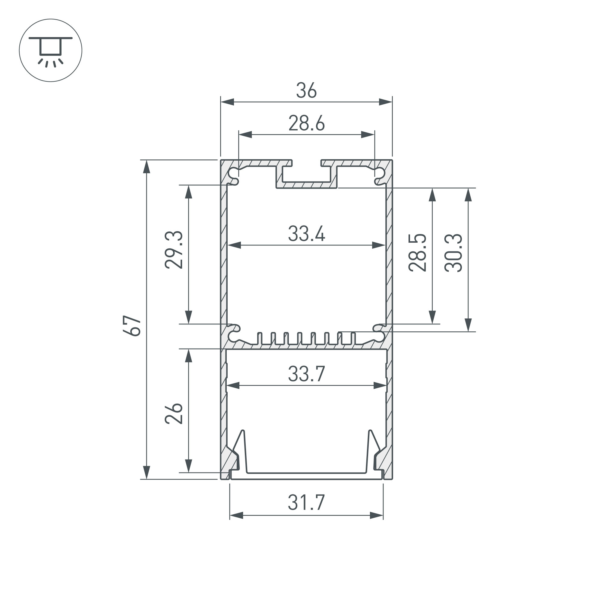 Подвесной/накладной профиль из алюминия черного цвета с отсеком для блока питания (32х29 мм) для основного освещения и контурной подсветки помещений. Габаритные размеры профиля составляют 3000 мм в длину, 35 мм в ширину и 67 мм в высоту. Площадка для установки светодиодных лент позволяет использовать ленту шириной до 33 мм и мощностью до 53 Вт/м. Это обеспечивает гибкость в выборе светодиодных лент и создает потрясающие световые решения.