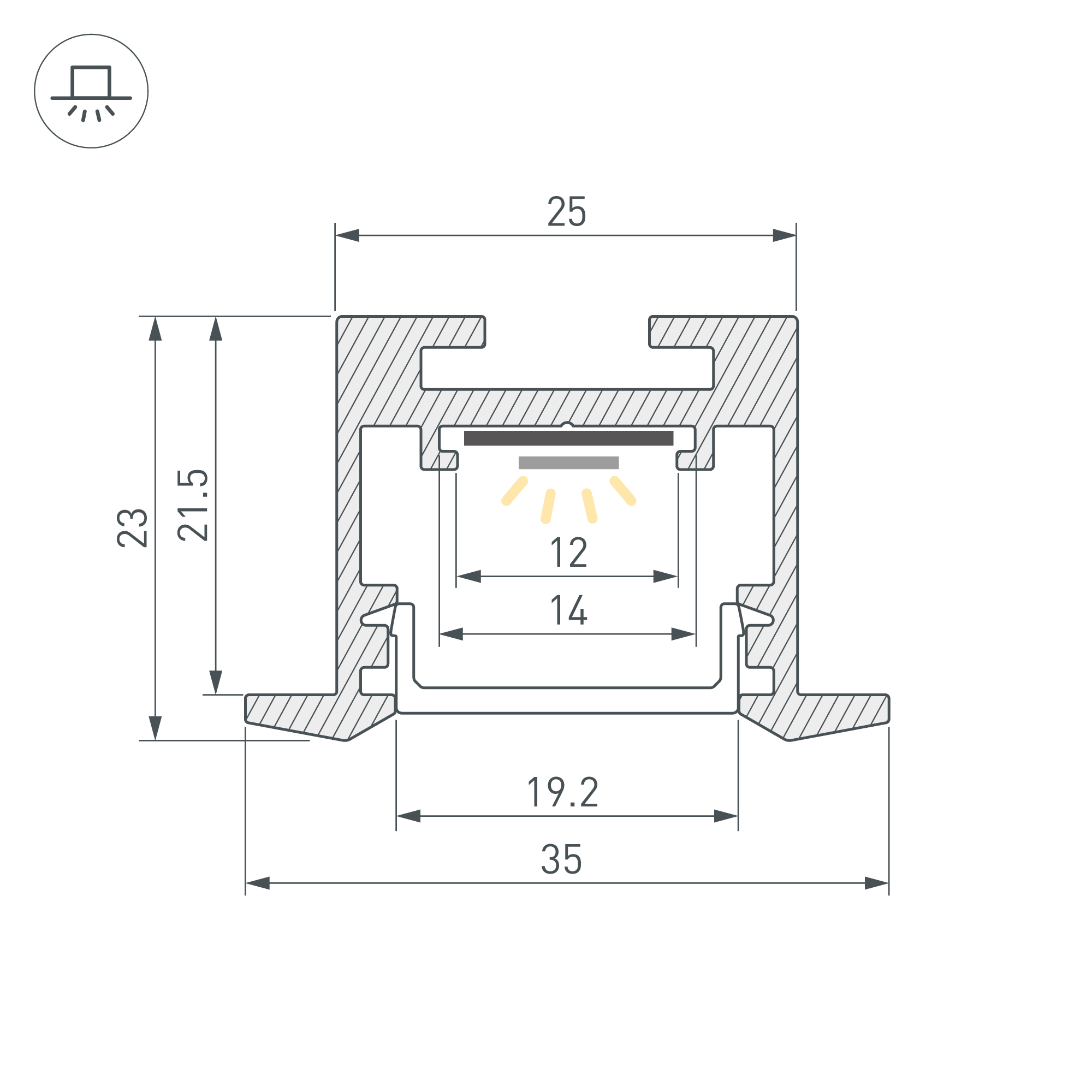 Встраиваемый профиль с накладным фланцем из алюминия белого цвета RAL9003 (порошковая окраска) для основной и контурной подсветки помещений. Габаритные размеры профиля составляют 2500 мм в длину, 35,6 мм в ширину и 23,2 мм в высоту паз установки 25 мм. Площадка для установки светодиодных лент позволяет использовать ленту шириной до 12 мм и мощностью до 28,02 Вт/м. Это обеспечивает гибкость в выборе светодиодных лент и создает потрясающие световые решения.