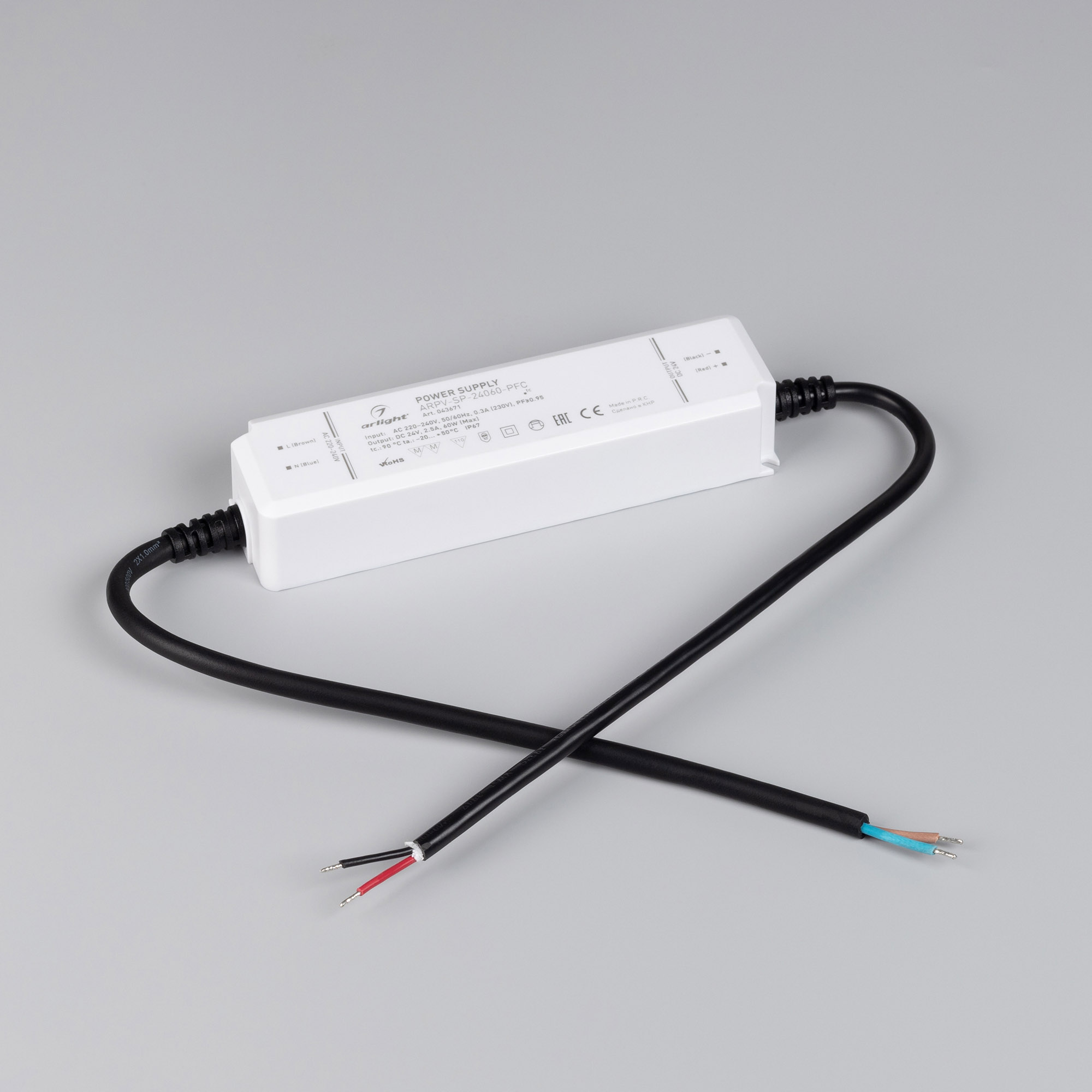 Источник напряжения с гальванической развязкой для светодиодных изделий. Входное напряжение 220-240 VAC. Выходные параметры: 24 В, 2,5 А, 60Вт. Встроенный PFC >0.95. Герметичный пластиковый корпус IP 67. Рабочая температура -20…+45C⁰. Габаритные размеры длина 156 мм, ширина 42 мм, высота 30 мм. Гарантийный срок 5 лет.