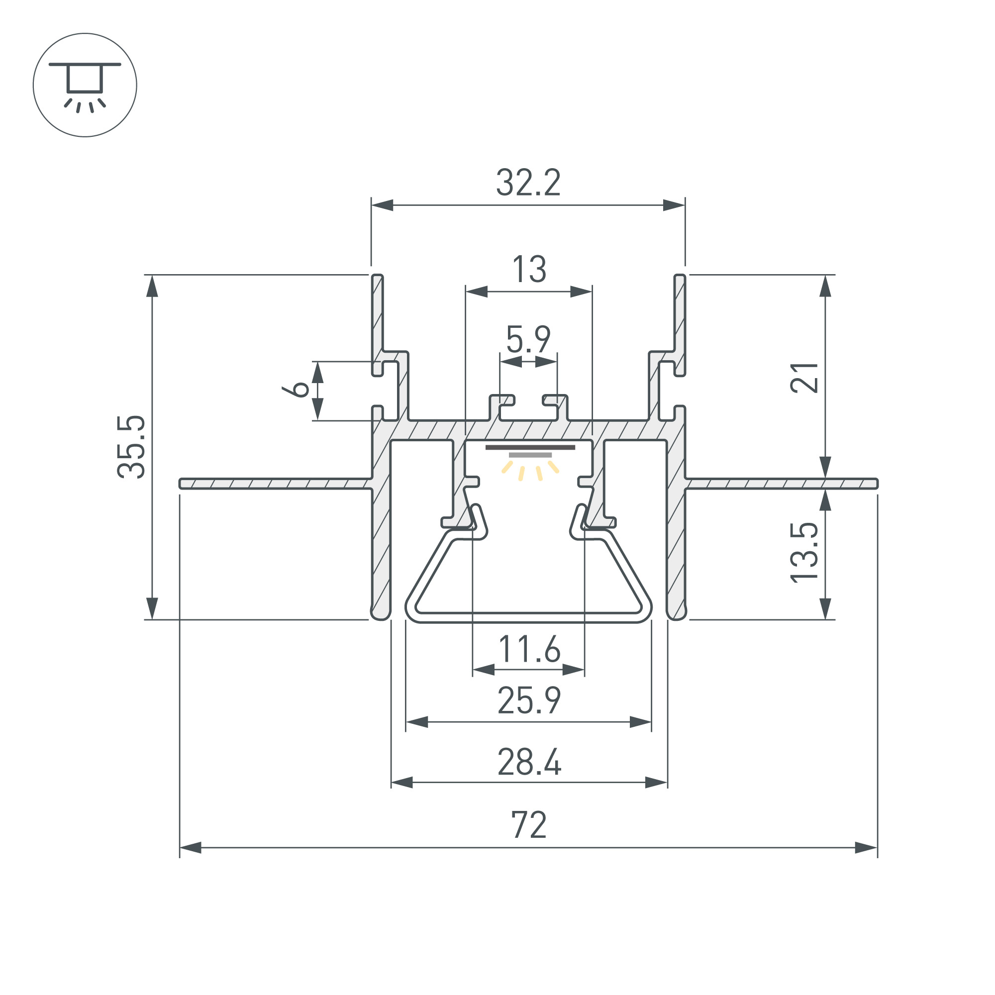 Встраиваемый алюминиевый профиль (центральная линия) для дизайнерских решений «линии света» в натяжных потолках. Решение 2-в-1: служит каркасом для крепления натяжного потолка и профилем для установки светодиодной ленты. Габаритные размеры профиля составляют 2000 мм в длину, 72 мм в ширину и 35,5 мм в высоту. Площадка для установки светодиодных лент позволяет использовать ленту шириной до 13 мм и мощностью до 40 Вт/м. Это обеспечивает гибкость в выборе светодиодных лент и создает потрясающие световые решения. Заглушки и другие аксессуары не включены в комплект и приобретаются отдельно. Цена указана за 1 метр профиля. Отличное решение для создания современных световых проектов.