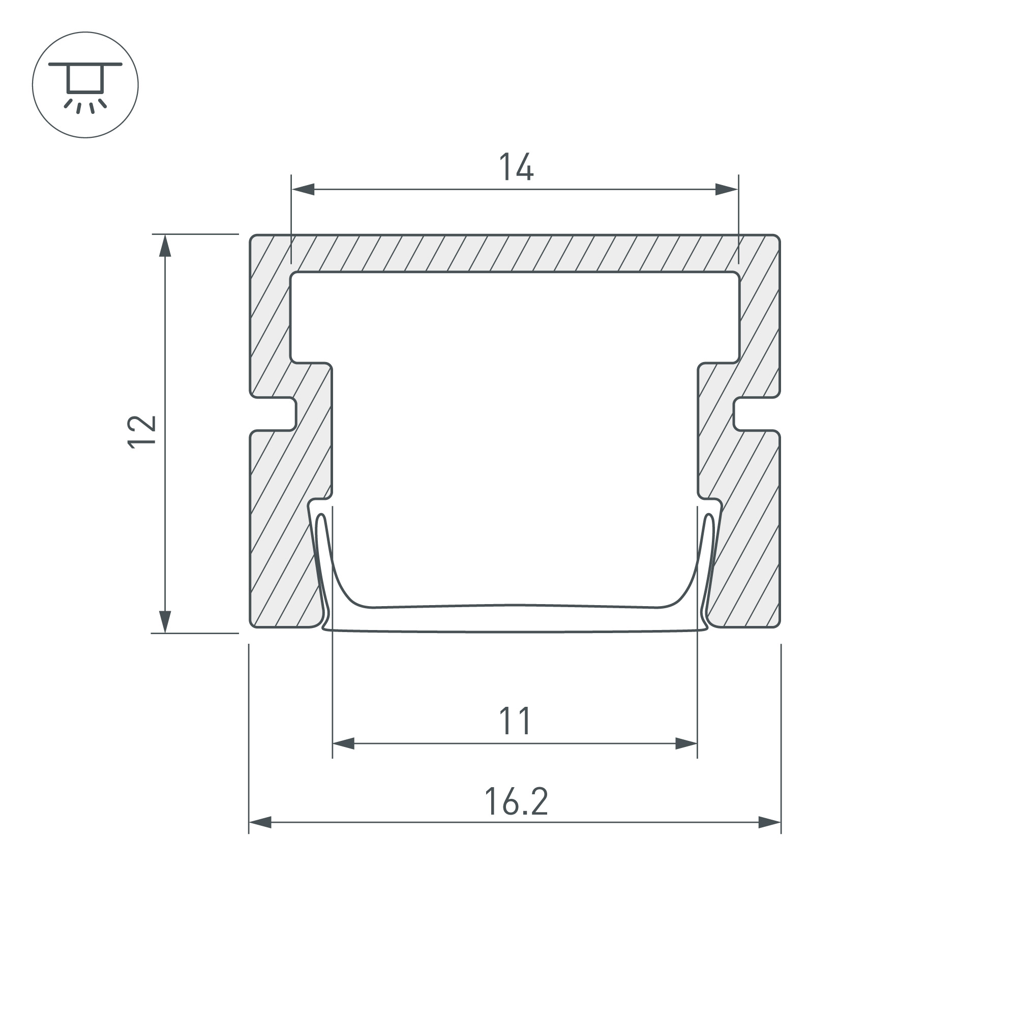 Габаритные размеры профиля составляют 2000 мм в длину, 16,2 мм в ширину и 12 мм в высоту. Площадка для установки светодиодных лент позволяет использовать ленту шириной до 14 мм и мощностью до 17 Вт/м. Это обеспечивает гибкость в выборе светодиодных лент и создает потрясающие световые решения.