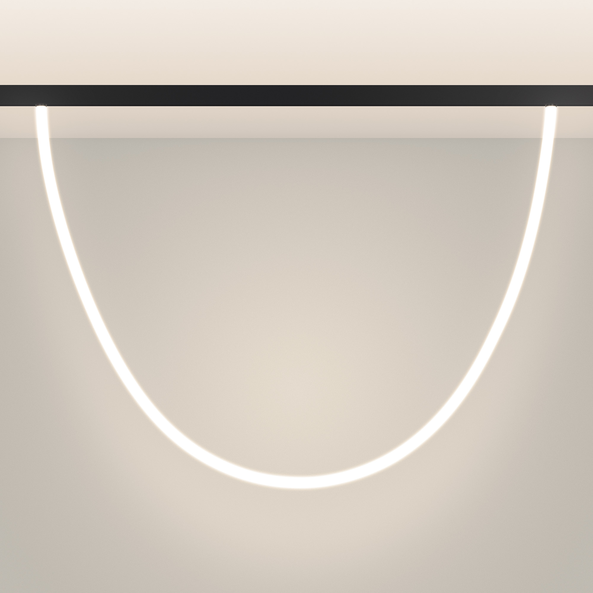 Светильник гибкий для магнитных треков серии ORIENT. Мощность 35 Вт, св. поток 2120 лм, 60 лм/Вт, теплый 3000 K, CRI>90, угол 360°, напряжение питания 48 В. Матовый белый фигурный корпус из силикона с черными креплениями. Размер: диаметр 25 мм, длина 2500 мм. Монтаж на магнитный трек ORIENT. Адаптеры в комплекте.