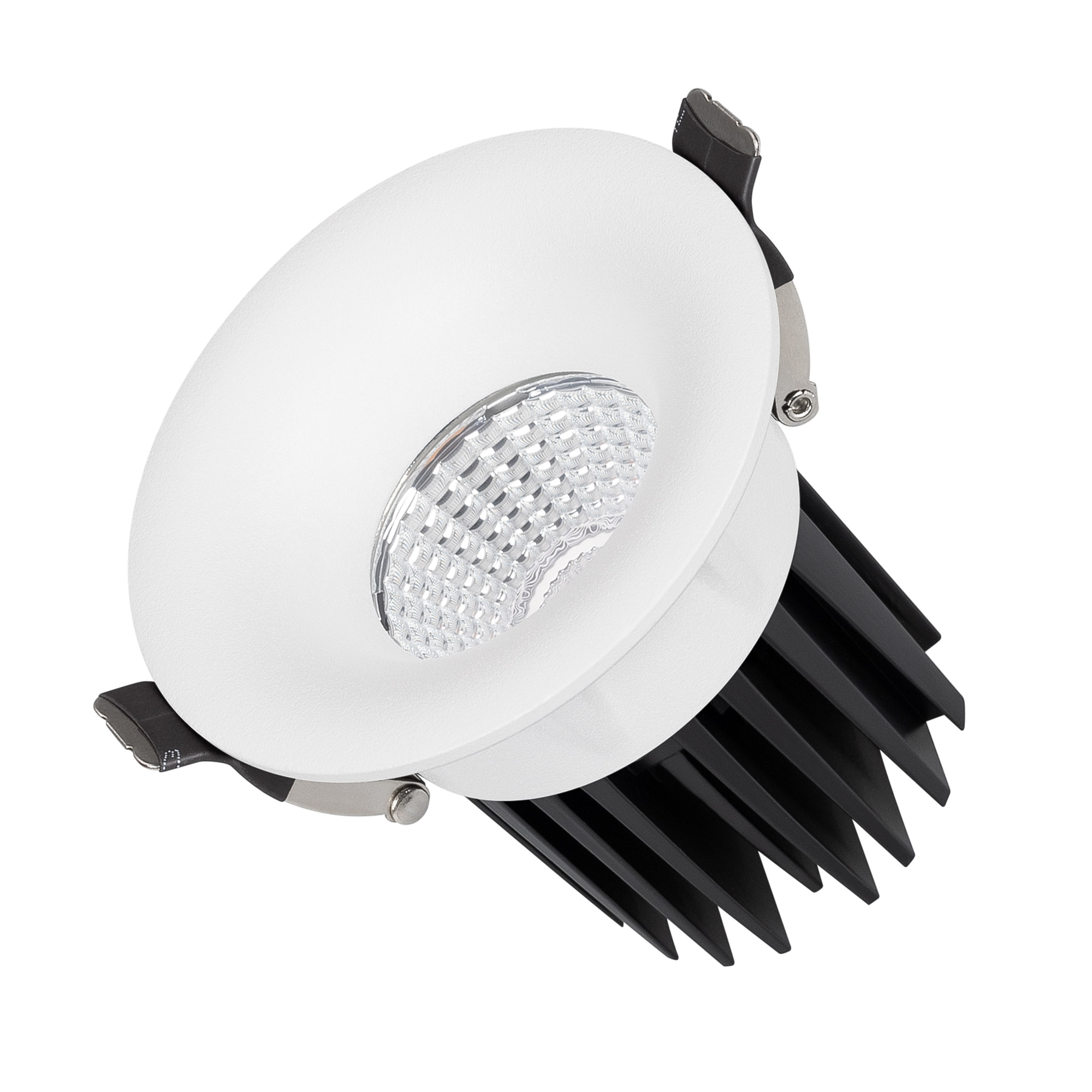 Встраиваемый светильник даунлайт. Мощность 10 Вт, св. поток 880 лм, 88 лм/Вт, тёплый 3000 K, CRI>90, угол 60°, напряжение питания 230 В. Белый круглый корпус из алюминия, экран PMMA, степень защиты IP54. Размер: диаметр 86 мм, высота 80 мм. Монтаж встраиваемый, установочное отверстие: диаметр 75 мм. Драйвер IP54, 20-40 В, 250 мА, пульсация <1%.
