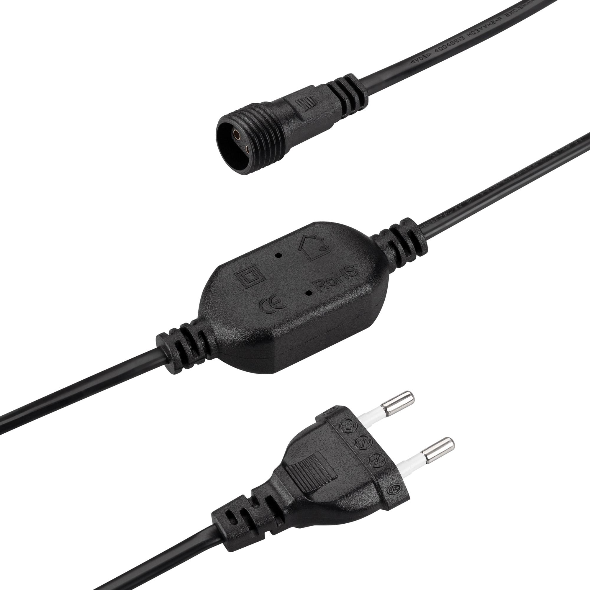 Шнур питания для светодиодных гирлянд с эффектом мерцания. Материал оболочки ПВХ. Цвет провода черный. В комплект входит: шнур питания с вилкой европейского стандарта (IP44), 2pin разъём подключения к гирлянде, выпрямитель AC/DC (1.6A). Длина провода 1.5 метра.