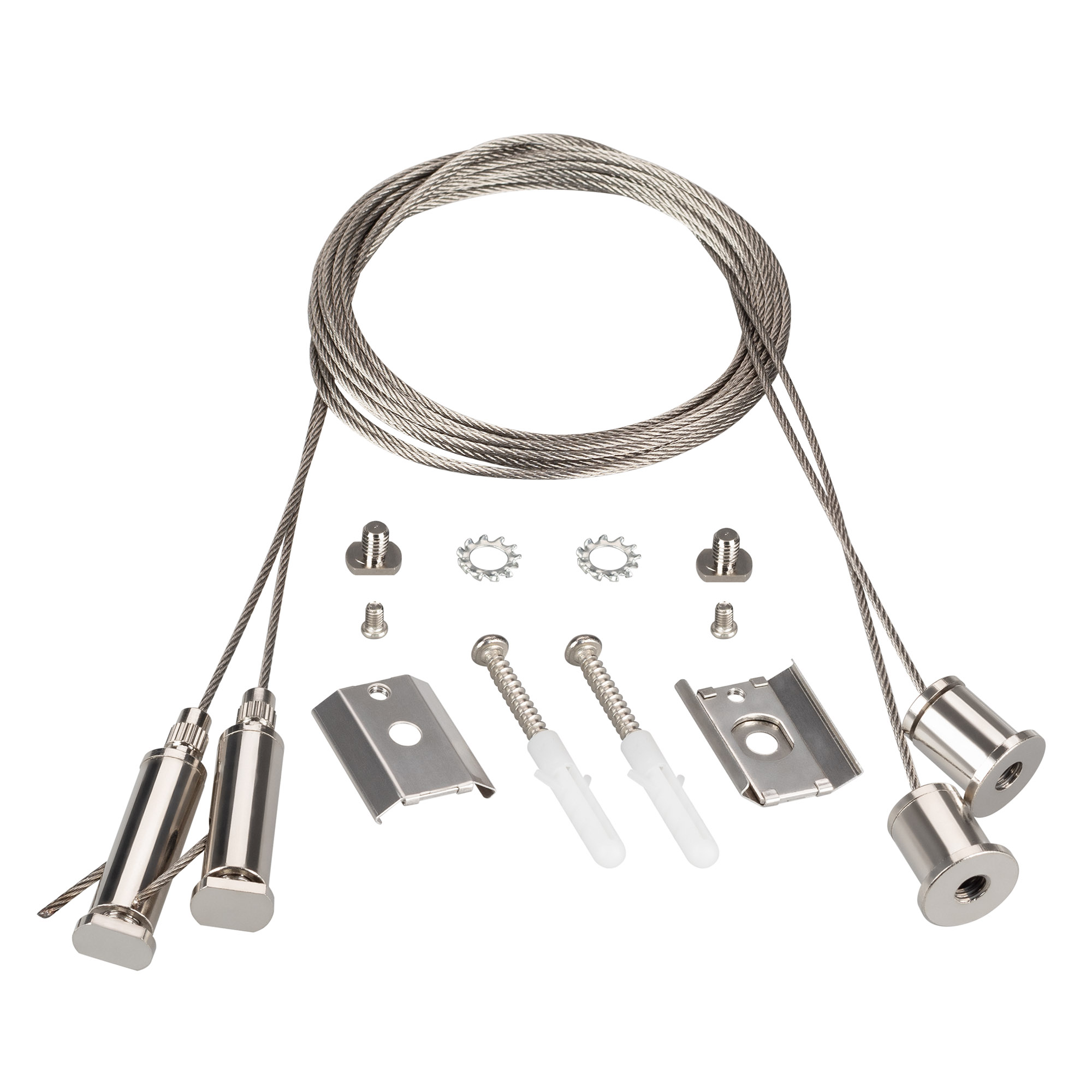 Подвес для профилей LINE-5075-HONEYCOMB. Цвет - серебристый. В комплекте: трос 2 м - 2 шт., держатель - 2 шт., шуруп с дюбелем - 2 шт. Максимальная нагрузка на 1 трос 7 кг. Цена за комплект.