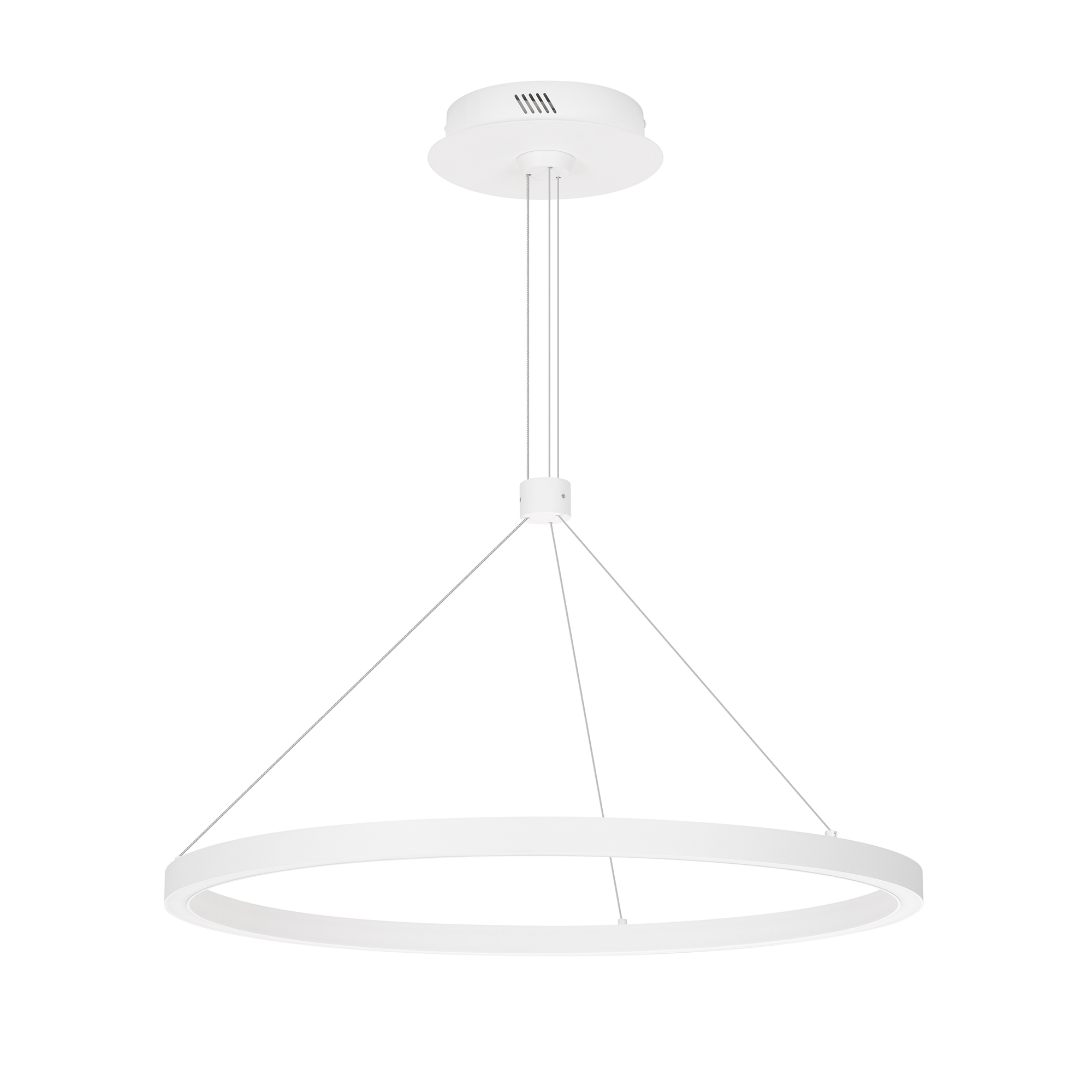 Подвесной светильник. Мощность 36 Вт, св. поток 2050 лм, 57 лм/Вт, теплый 3000 K, CRI>90, угол 120°, напряжение питания 230 В. Белый круглый корпус из алюминия, экран силикон, степень защиты IP20. Размер: диаметр 600 мм, высота 25 мм, ширина профиля 25 мм, размер чаши: диаметр 170 мм, высота 40 мм. Монтаж подвесной, длина подвеса 1200мм. Драйвер 33-40 В, 900 мА. Пульсация <5%.