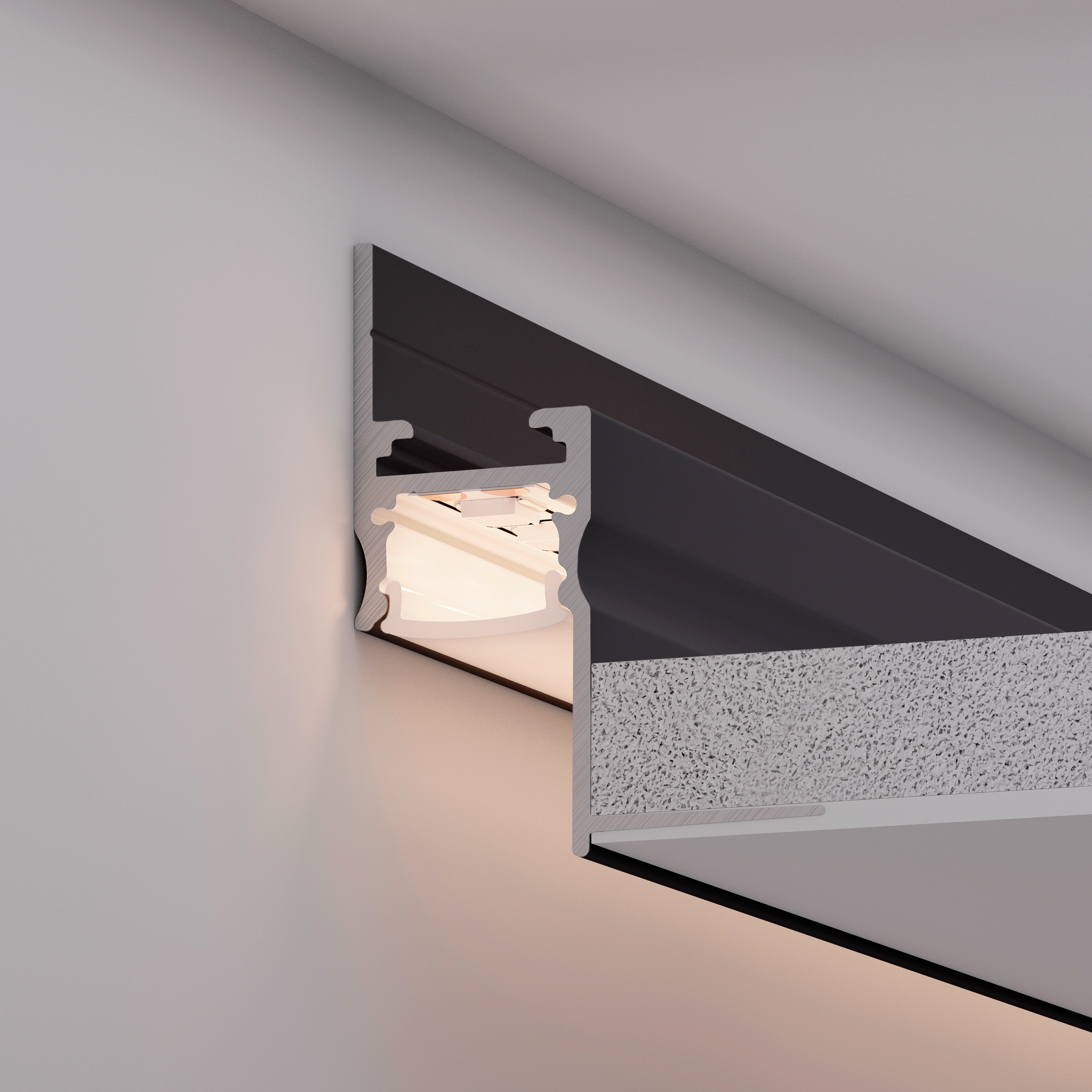 Встраиваемый алюминиевый профиль чёрного цвета со скрытым фланцем устанавливается в потолки и потолочные ниши из гипсокартона, образуя теневой зазор между потолком и стеной. Такое решение создает визуальный эффект потолка, парящего в воздухе с мягким свечением по периметру комнаты. Габаритные размеры профиля составляют 2000 мм в длину, 41 мм в ширину и 51 мм в высоту. Площадка для установки светодиодных лент позволяет использовать ленту шириной до 13,3 мм и мощностью до 47,7 Вт/м. Это обеспечивает гибкость в выборе светодиодных лент и создает потрясающие световые решения. Экраны, заглушки и другие аксессуары не включены в комплект и приобретаются отдельно. Цена указана за 1 метр профиля. Отличное решение для создания современных световых проектов. Перед установкой профиля в гипсокартон ОБЯЗАТЕЛЬНО установите в профиль экран.