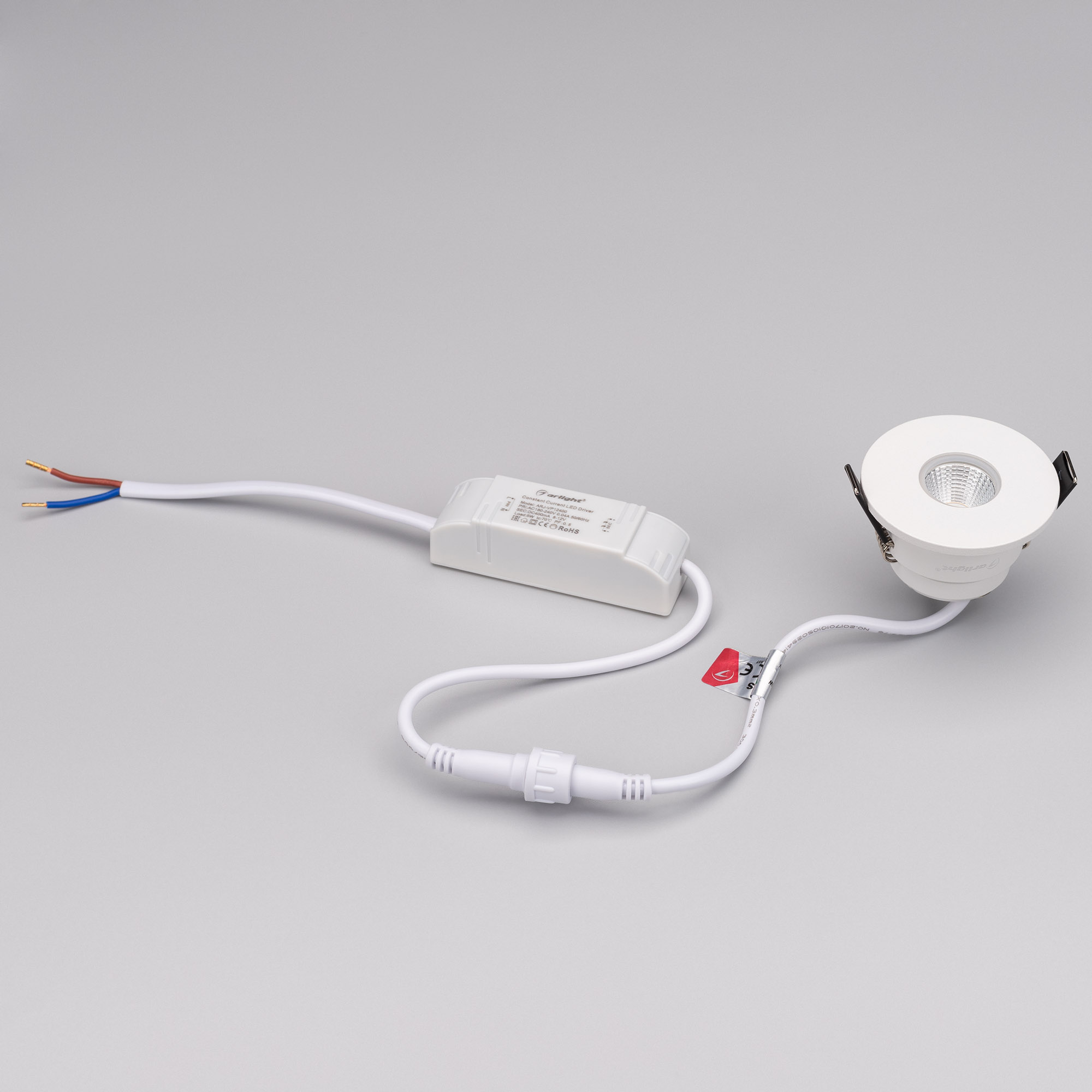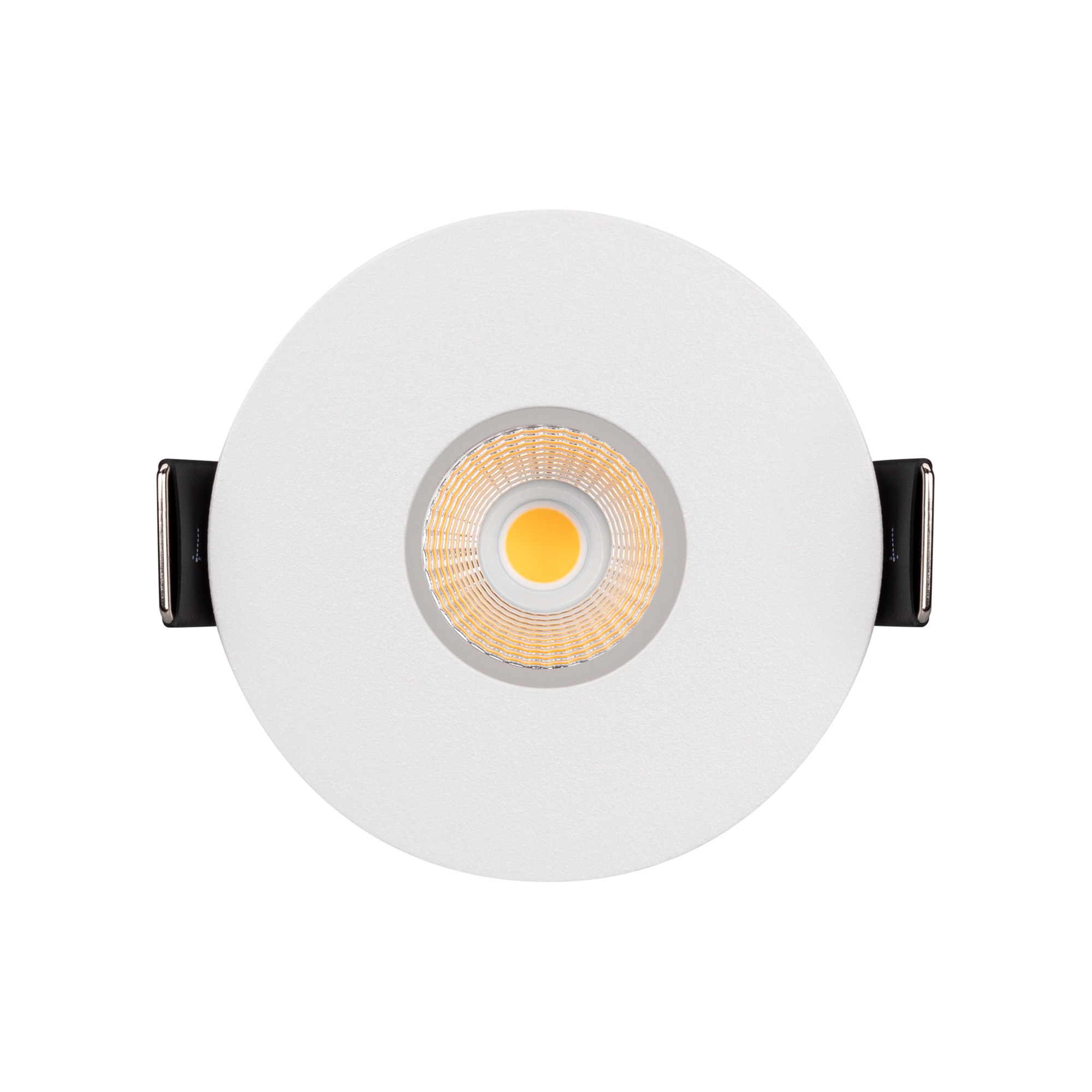 Встраиваемый светильник даунлайт. Мощность 5 Вт, св. поток 400 лм, 80 лм/Вт, дневной 4000 K, CRI>90, угол 60°, напряжение питания 230 В. Белый круглый корпус из алюминия, экран PMMA, степень защиты IP54. Размер: диаметр 54 мм, высота 30 мм. Монтаж . Монтаж встраиваемый, установочное отверстие: диаметр 45 мм. Драйвер IP54, 8-12 В, 400 мА, пульсация <2%.