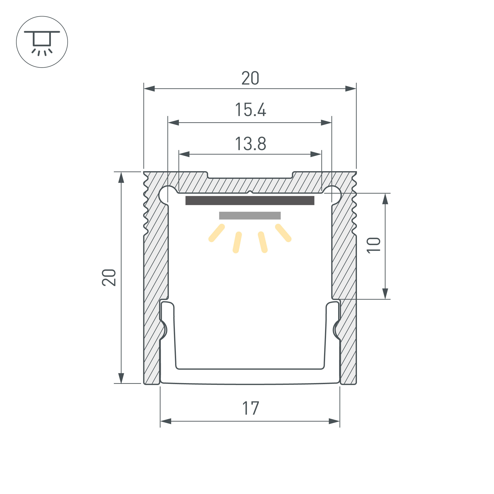 Алюминиевый профиль для светодиодных лент и линеек. Цвет - белый RAL9003 (порошковая окраска). Габаритные размеры (L×W×H): 2000x20x20 мм. Ширина площадки для ленты 15 мм. Экраны, заглушки и другие аксессуары приобретаются отдельно. Цена за 1 метр.