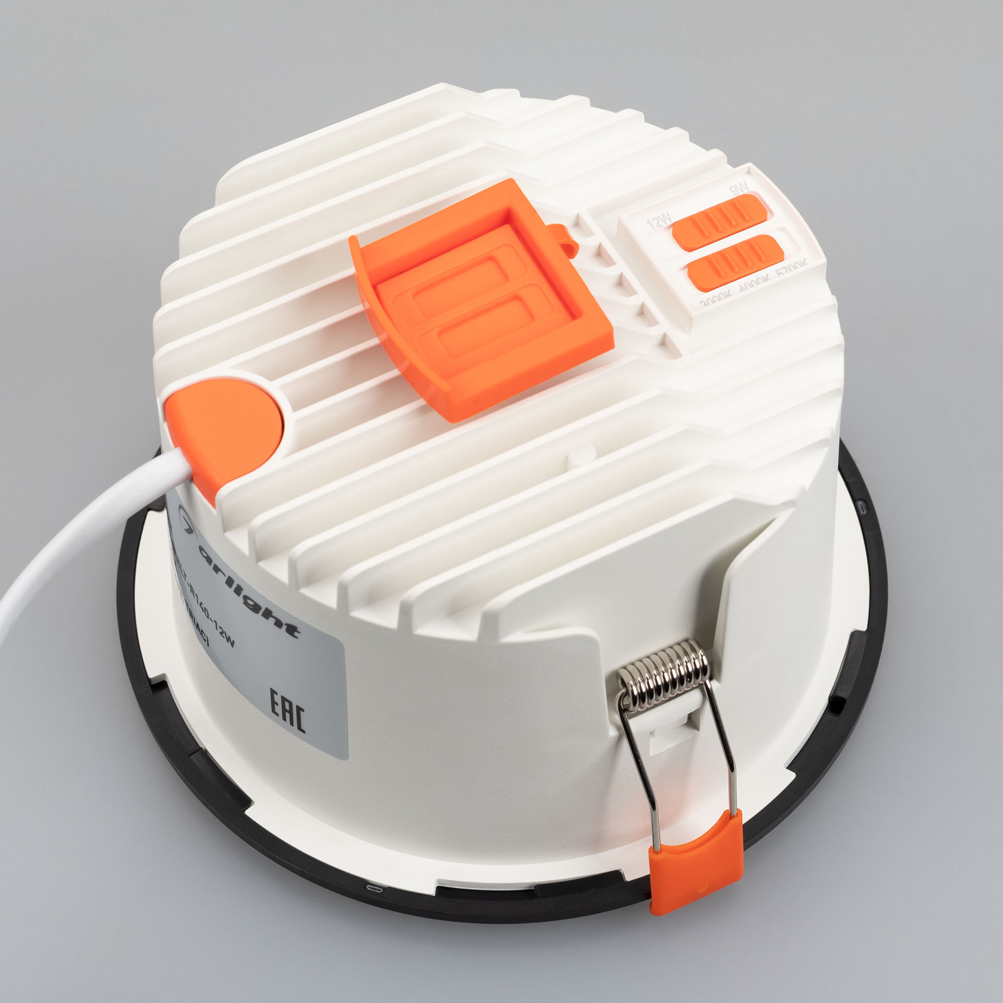 Встраиваемый светильник даунлайт с изменяемой мощностью и цветовой температурой. Мощность 9-12 Вт, св. поток 875-1200лм, 100 лм/Вт, цветовая температура 3000-4000-5700 K, CRI>90, угол 60°, напряжение питания 230 В. Чёрный круглый корпус, степень защиты IP54. Размер: диаметр 140 мм, высота 80 мм. Монтаж встраиваемый, установочное отверстие: диаметр 122-127 мм. TRIAC-драйвер, пульсация <1%.