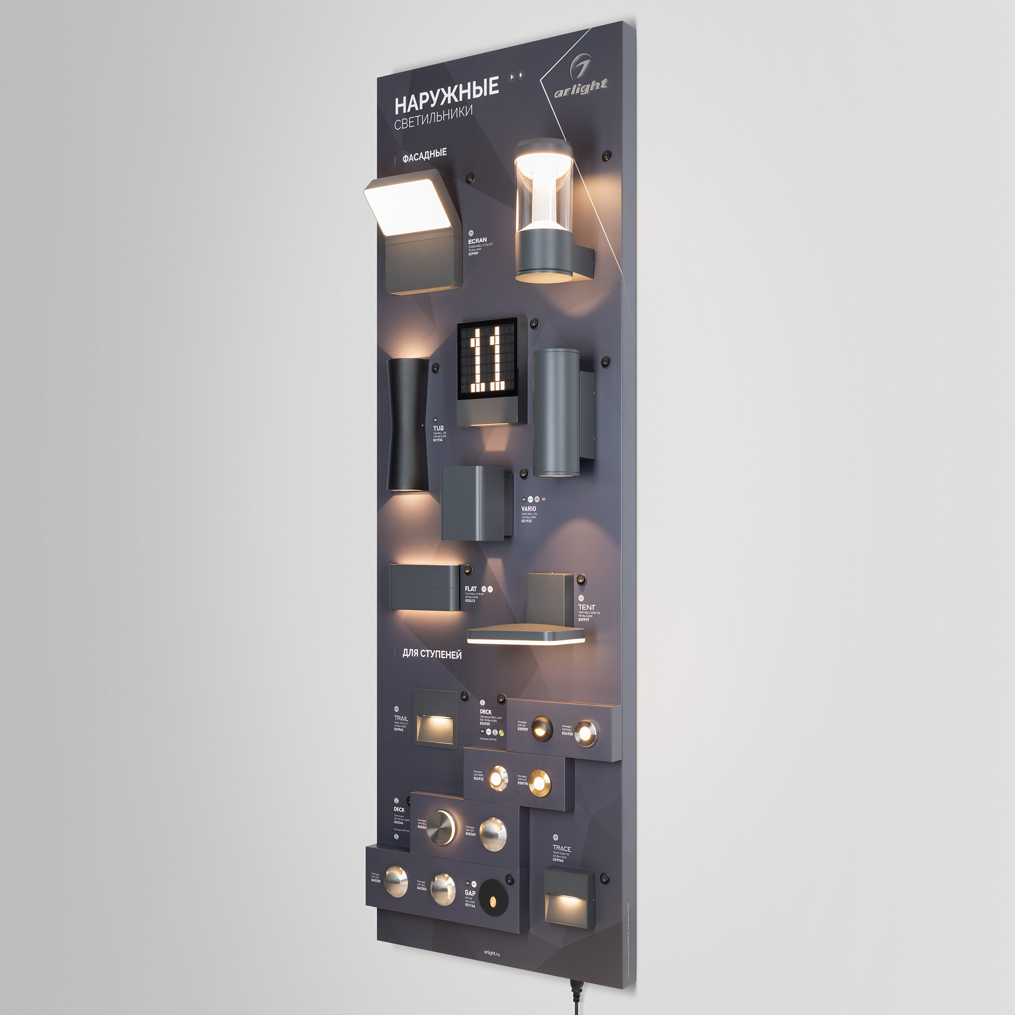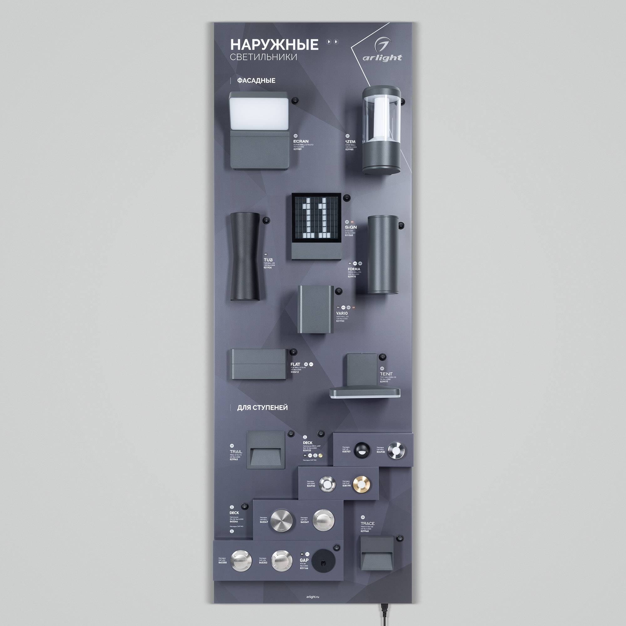 Стенд НАРУЖНОЕ ОСВЕЩЕНИЕ. Фасадные серии - SIGN, STEM, ECRAN, TUB, FORMA, VARIO, WALL FLAT, TENT , для ступеней - TRAIL, DECK, TRACE, GAP. Материал корпуса - алюкобонд, пленка, печать. Габаритные размеры (Ширина Х Высота Х Глубина), 600х1760х190 мм.