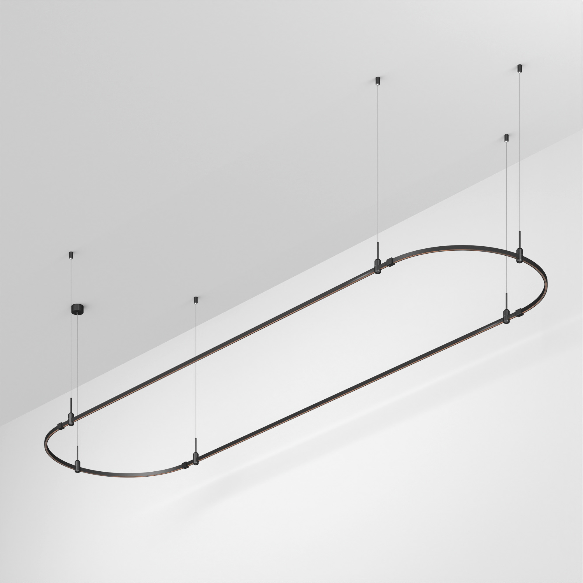 Подвесная конструкция APRIORI, форма овал. В комплекте треки с аксессуарами и гибкими подвесами. DC48V. Материал алюминий, цвет черный. Размер ДxШxВ: 4000x1000x22мм. Светильники и источники питания приобретаются отдельно.