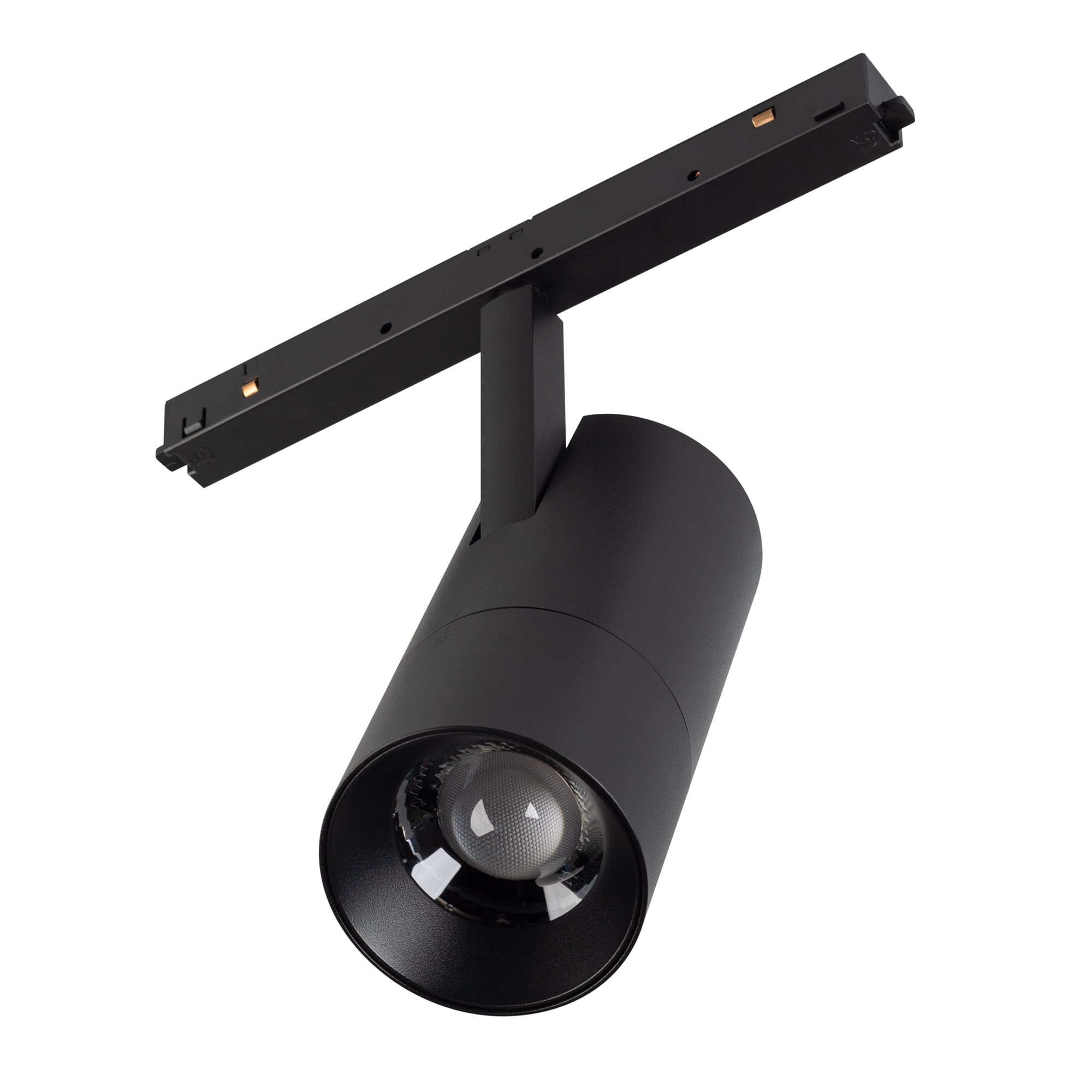 Светильник для магнитных треков MAG-ORIENT шириной 26 мм, с управлением по DALI. Мощность 15 Вт, св. поток 1180 лм, 79 лм/Вт, дневной 4000 K, CRI>93, угол 20-60°, напряжение питания 48 В. Черный фигурный корпус из металл, экран поликарбонат, степень защиты IP20. Размеры LxWxH 204x66x211 мм. Длина светоизлучающего модуля 145мм. Монтаж на трек MAG-ORIENT. Изменяемый угол светового потока, шаг регулировки 1 градус.