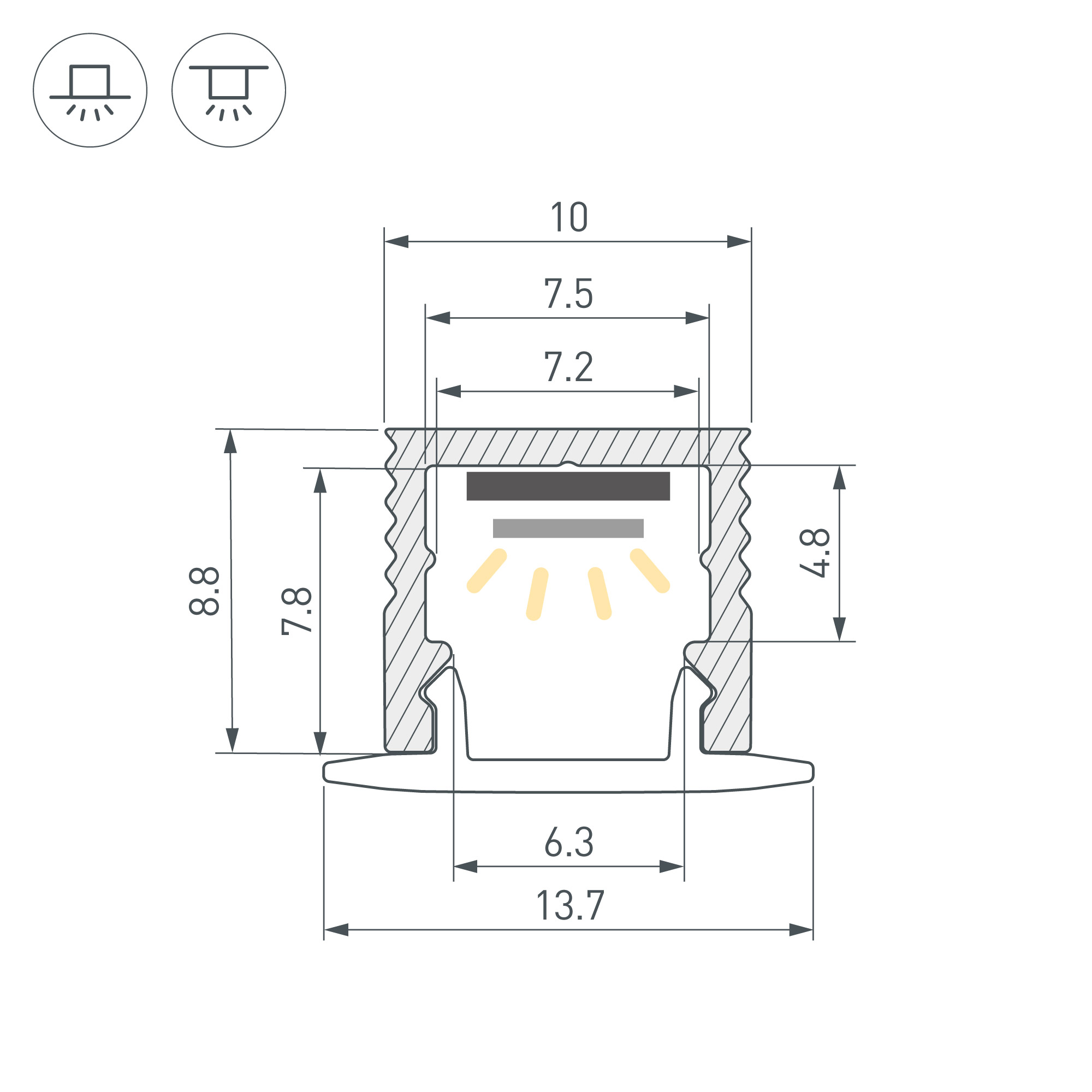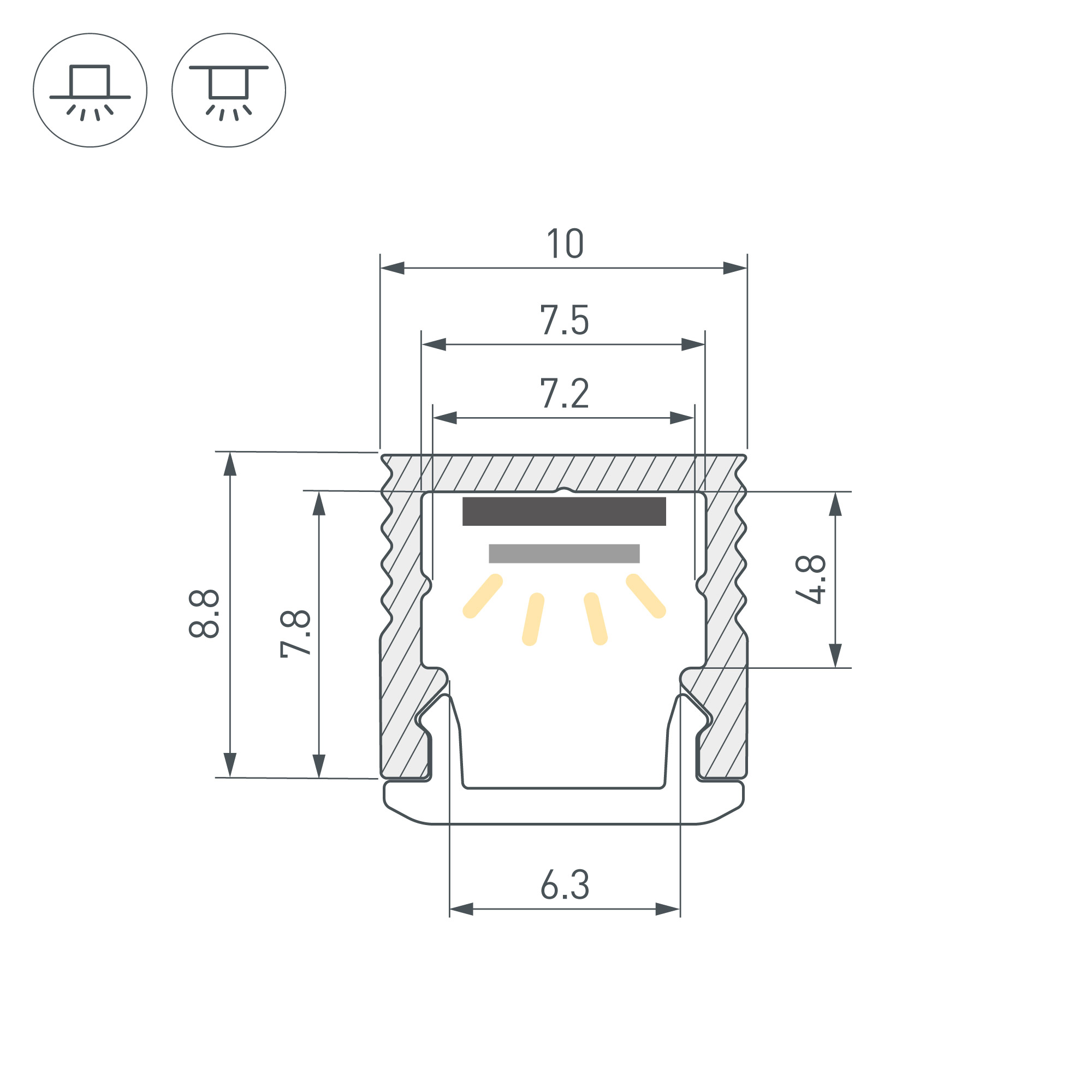 Накладной профиль из анодированного алюминия для подсветки мебели, пазов, ниш и других элементов интерьера. Габаритные размеры профиля составляют 2000 мм в длину, 10 мм в ширину и 8,8 мм в высоту. Площадка для установки светодиодных лент позволяет использовать ленту шириной до 7,5 мм и мощностью до 10 Вт/м. Это обеспечивает гибкость в выборе светодиодных лент и создает потрясающие световые решения.