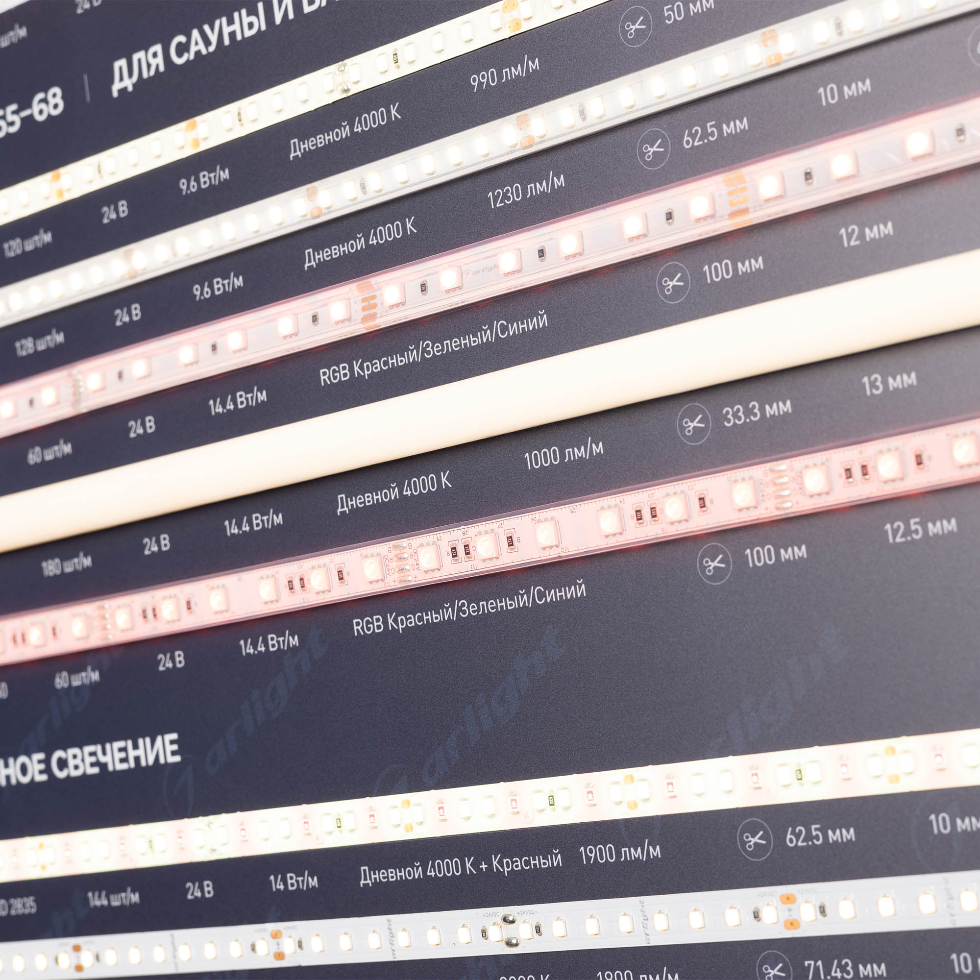 На стенде представлены ленты для решения специализированных задач освещения: узкие, с кратностью реза в 1 светодиод, стабилизированные (с подключением до 50 м), для изогнутых поверхностей, герметичные (IP65–68), для саун и бассейнов, с линзами 160°, для подсветки витрин (со смещенным спектром, продуктовая линейка), UVA (ультрафиолет).