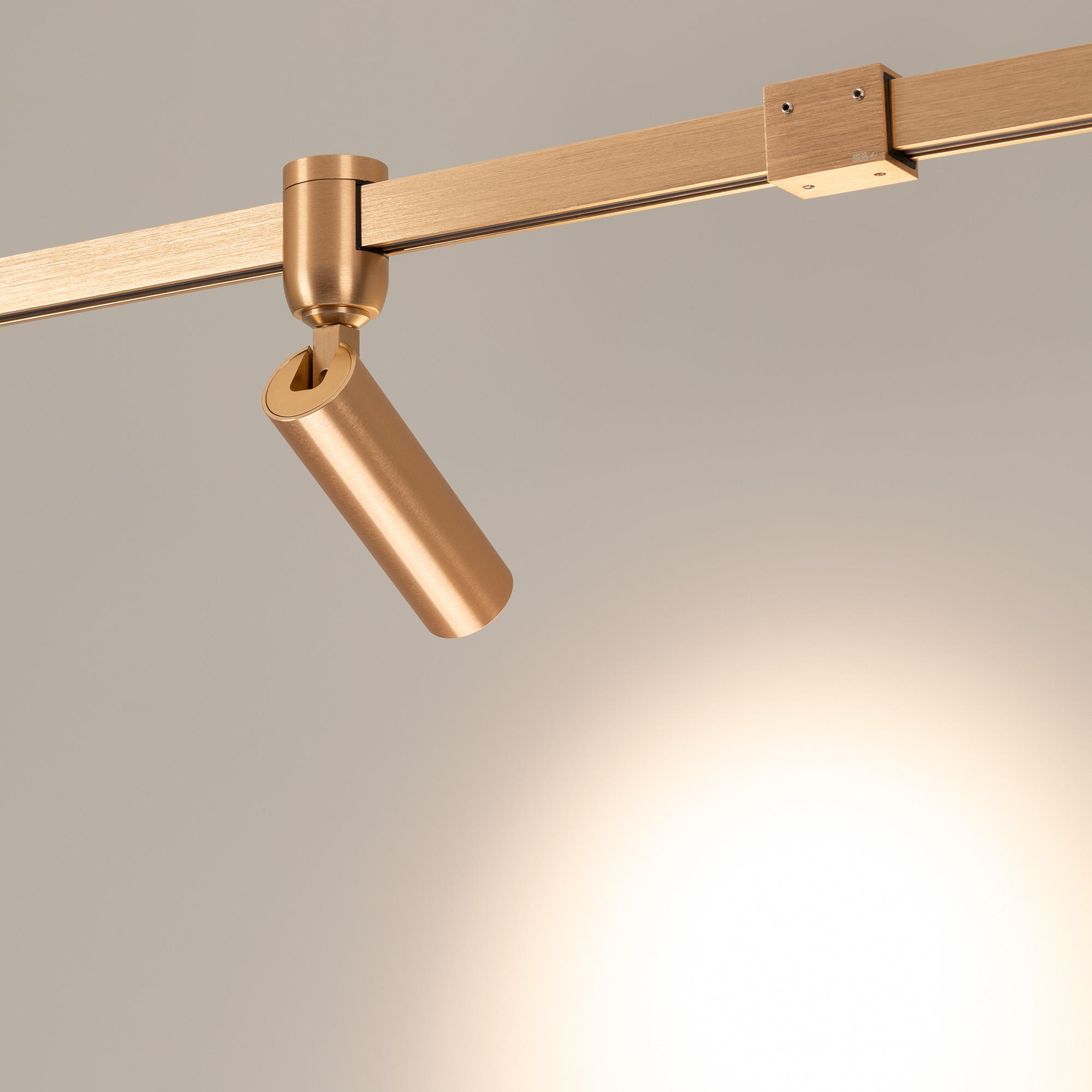 Светильник поворотный для треков APRIORI шириной 17 мм. Мощность 8 Вт, св. поток 580 лм, 73 лм/Вт, теплый 3000 K, CRI>92, угол 36°, напряжение питания 48 В. Фигурный корпус из алюминия, анодированного в цвет светлое золото, степень защиты IP20. Размер: Ø38 x 187 мм. Монтаж на трек APRIORI 17 мм. Пульсация <1%. Возможно диммирование по ШИМ (PWM) или не адресное управление при использовании диммируемого драйвера Dali, 0-10V, TRIAC.