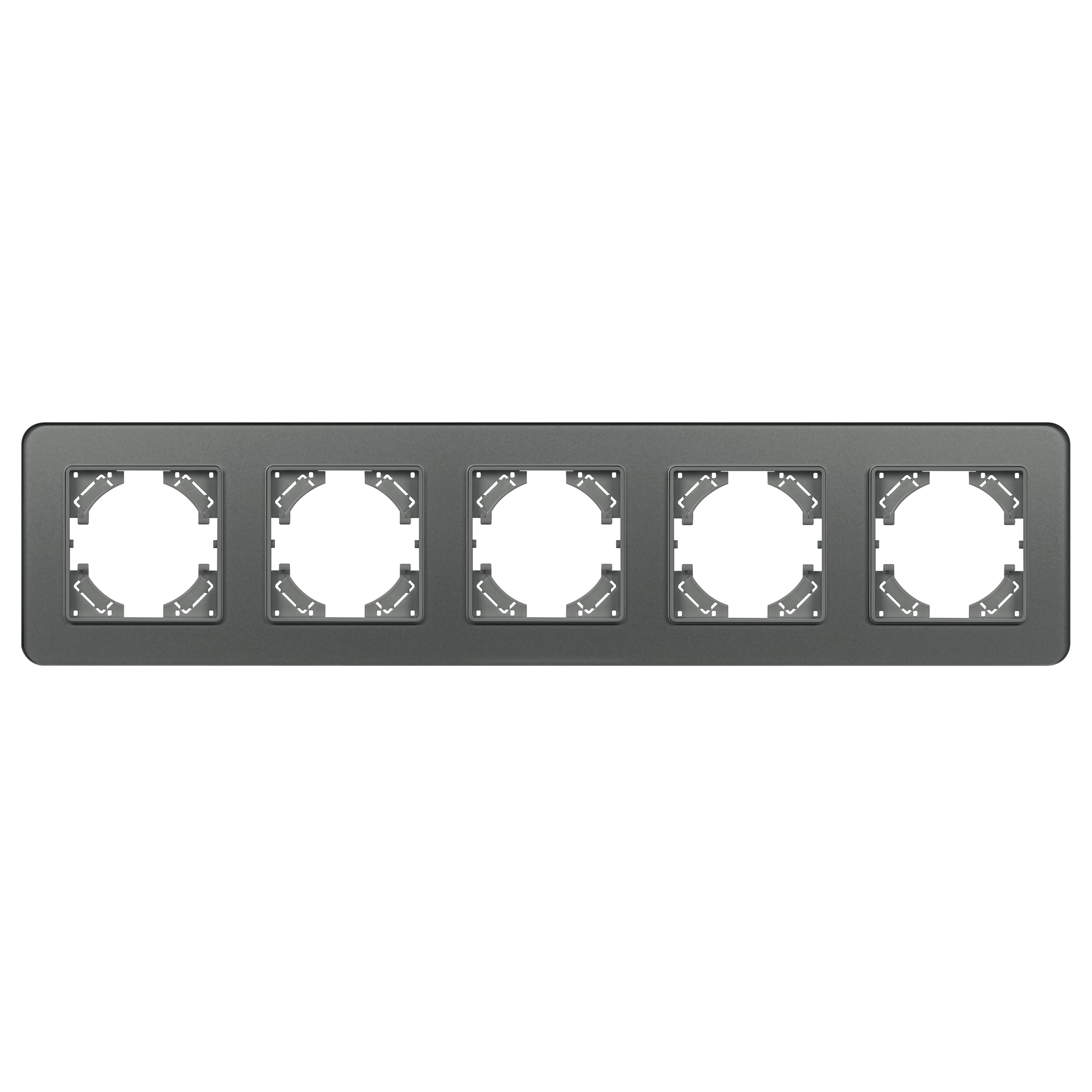 Рамка стеклянная на 5 постов, под встраиваемый механизм. Цвет - серый с Soft-Touch покрытием. Уровень герметичности IP20. Ориентация монтажа - горизонтальная (основным ориентиром служат посадочные выступы для накладки механизма).