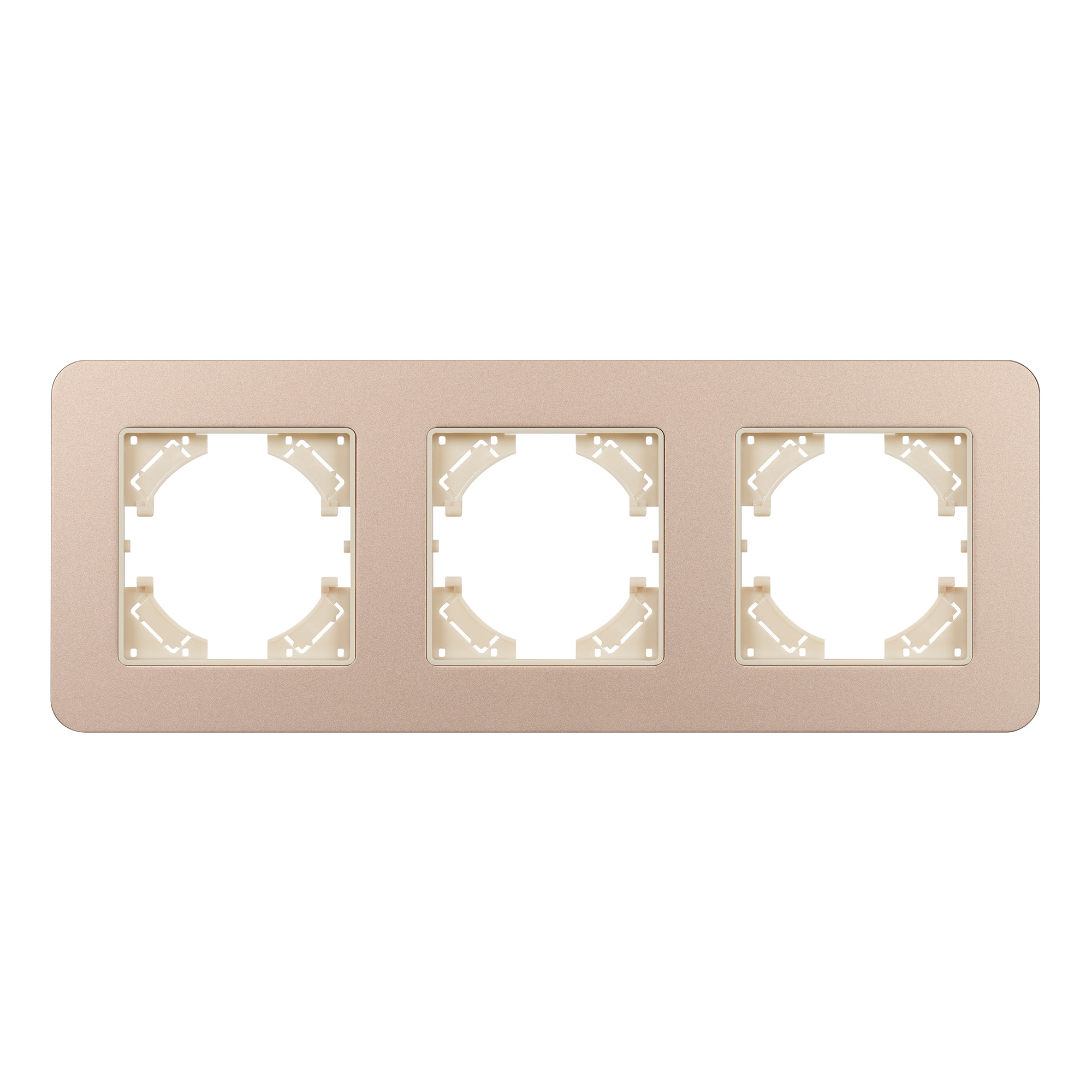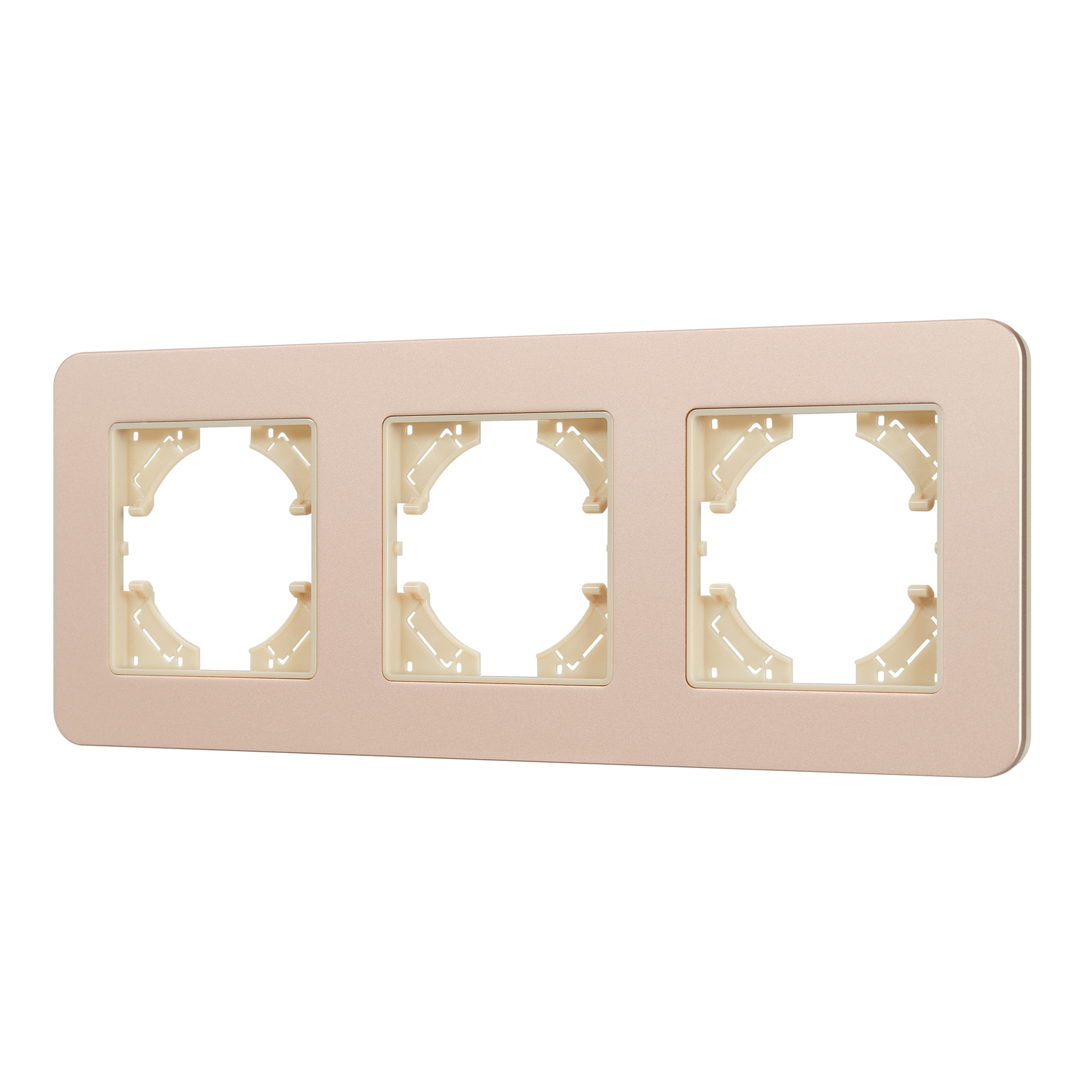 Рамка алюминиевая на 3 поста, под встраиваемый механизм. Цвет - золотой с Soft-Touch покрытием. Уровень герметичности IP20. Ориентация монтажа - горизонтальная (основным ориентиром служат посадочные выступы для накладки механизма). Габаритные размеры: длина 228 мм, ширина 86 мм, высота 7 мм. Гарантийный срок 12 мес.