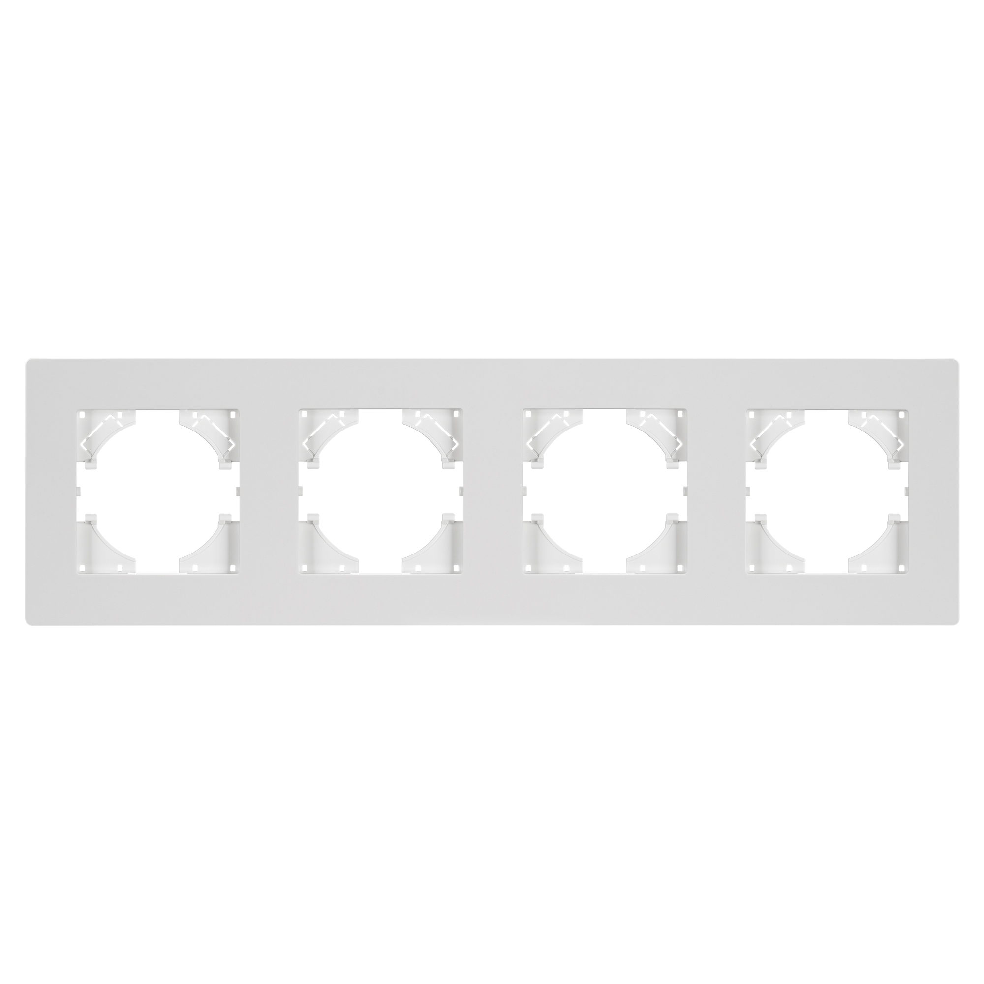 Рамка пластиковая на 4 поста, под встраиваемый механизм. Цвет - белый. Уровень герметичности IP20. Ориентация монтажа - горизонтальная (основным ориентиром служат посадочные выступы для накладки механизма).