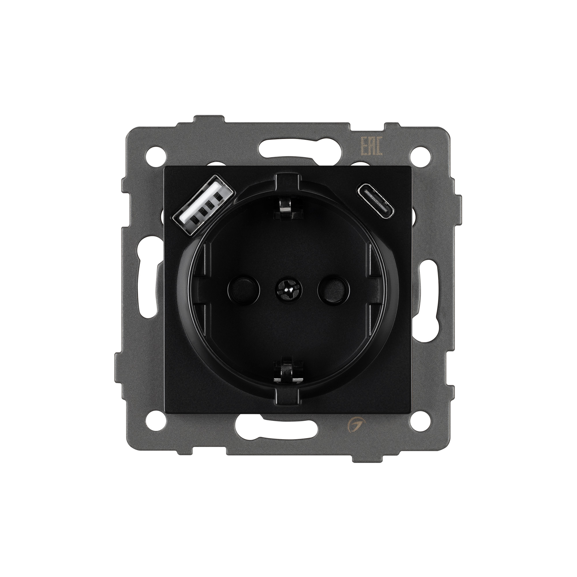Механизм розетки с заземлением 1 пост 2 USB Type A+C порта. Цвет - черный. Без фронтальной рамки. Уровень пылевлагозащиты IP20. Устанавливается в стандартный подрозетник. Габаритные размеры: длина 71 мм, ширина 71 мм, высота 53 мм. Гарантийный срок 10 лет.