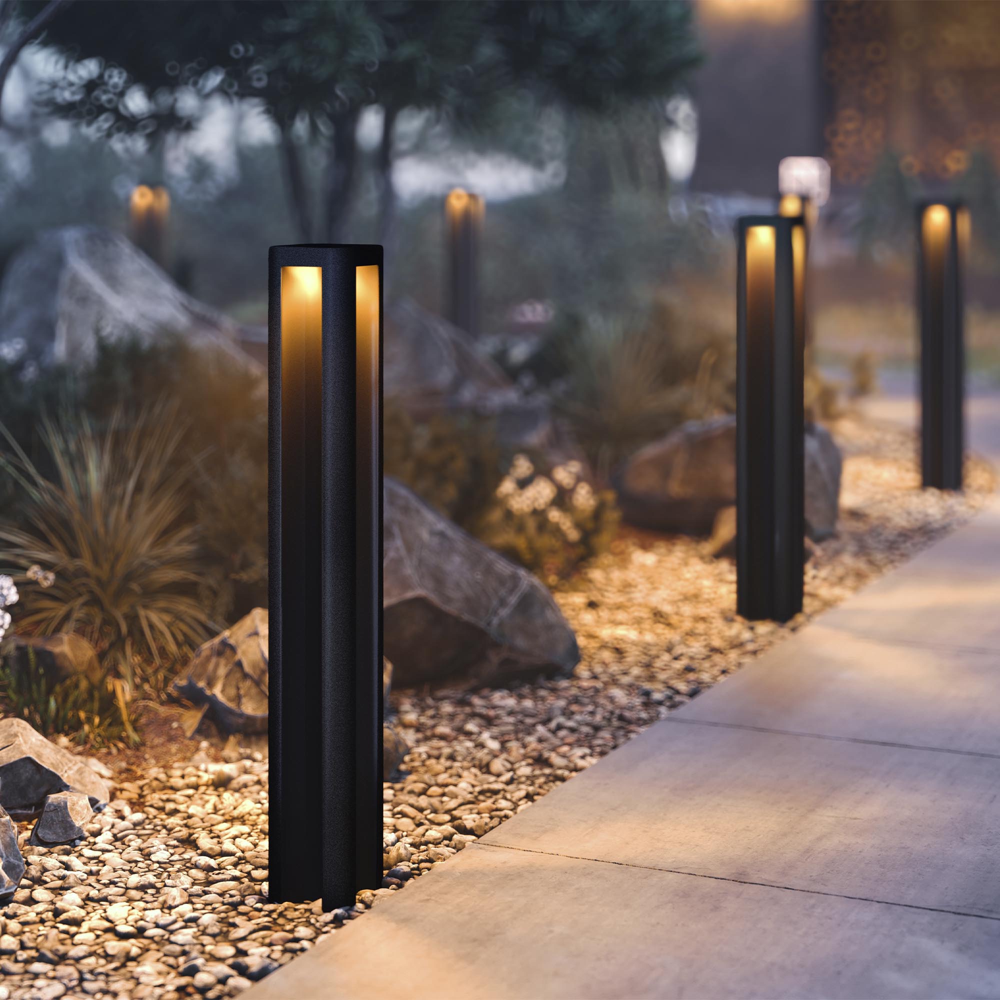 Уличный светодиодный светильник для освещения дорожек. Мощность 18 Вт. Цвет теплый белый 3000К, световой поток 930 лм, угол 45°. Влагозащищенный корпус IP65 - черный алюминий, экран из поликарбоната. Питание 230 В, мощность 18 Вт. Размеры светильника ДхШхВ: 132х132х900 мм. Монтаж накладной, комплект крепежа поставляется со светильником.