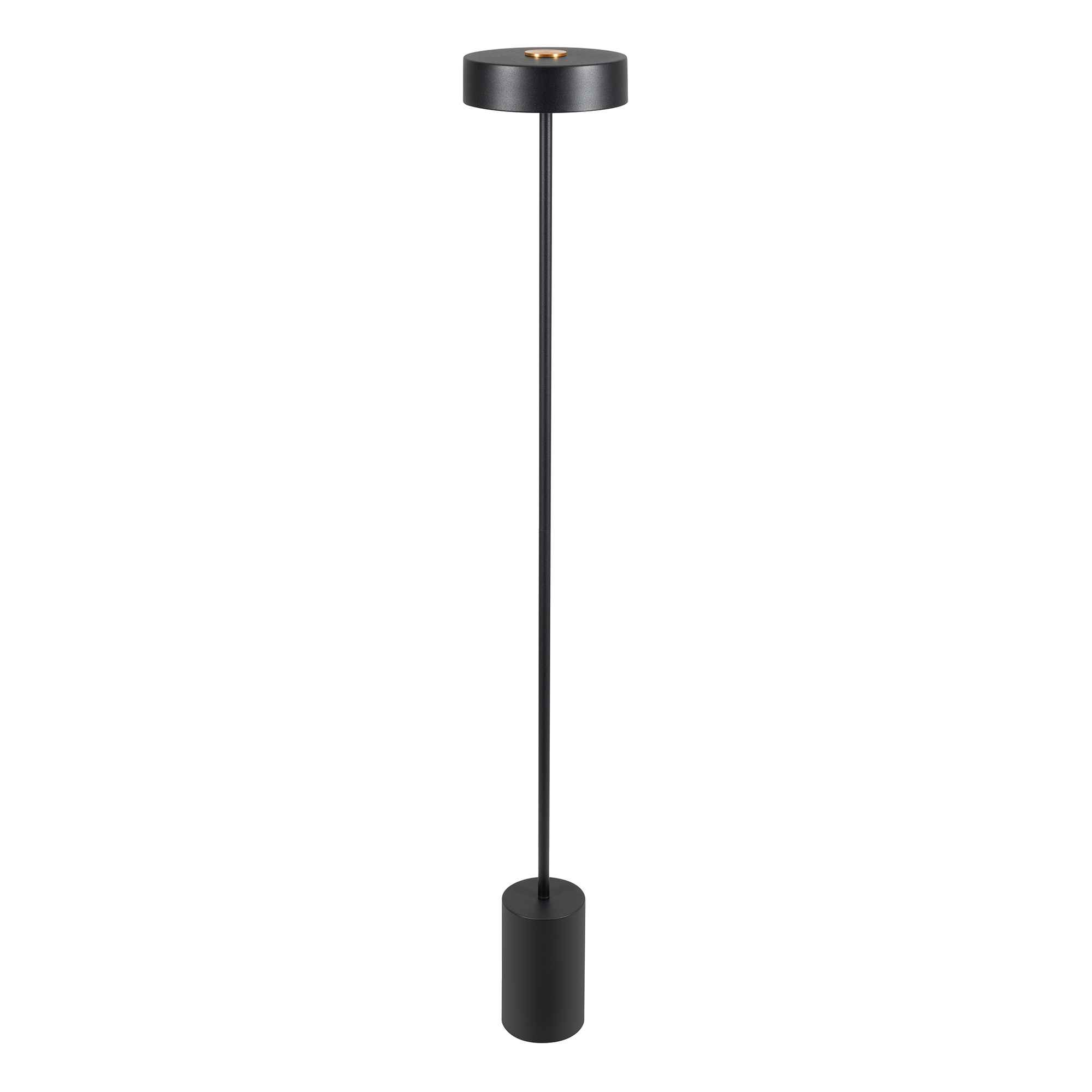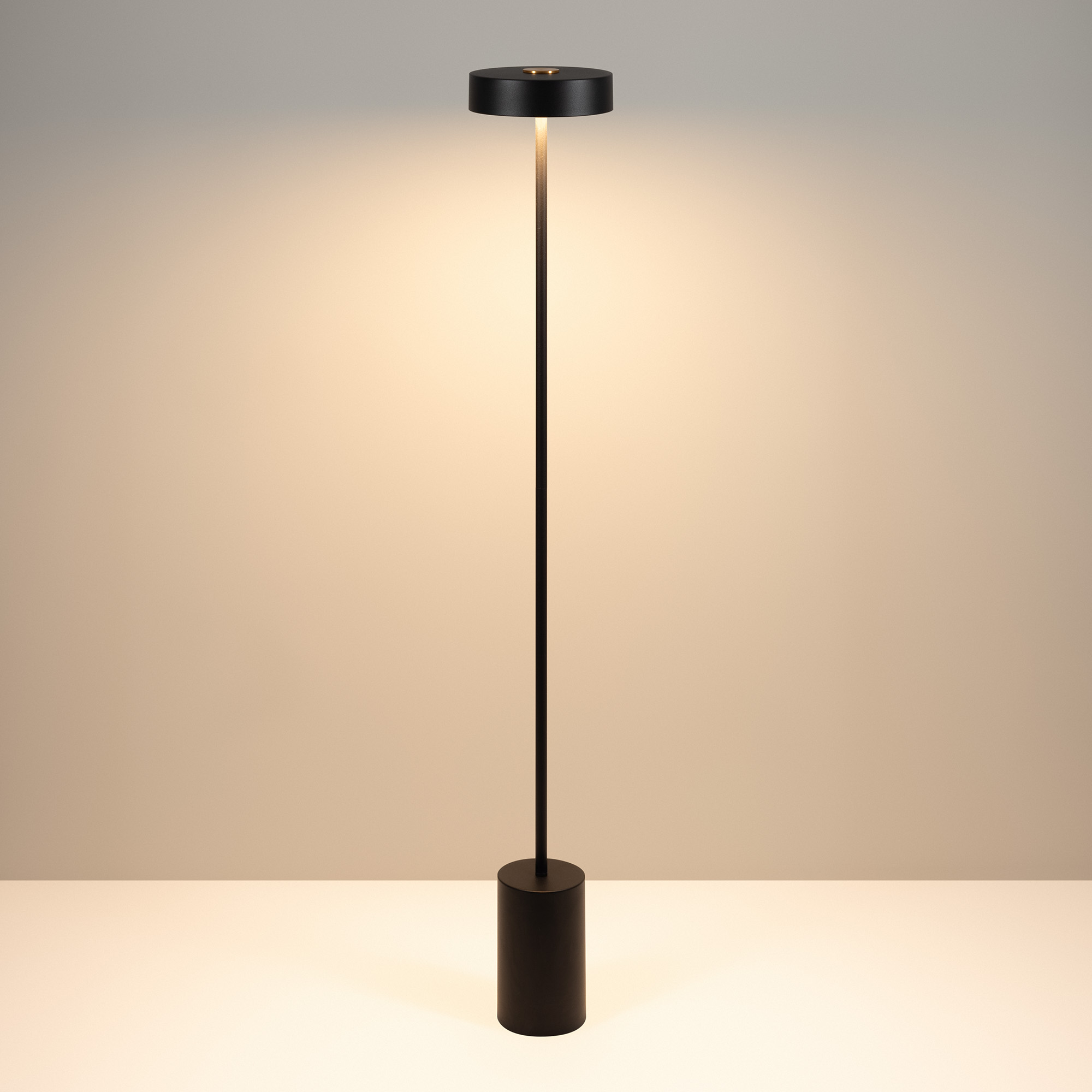 Декоративный напольный светильник. Мощность 16 Вт, св. поток 1230 лм, 76 лм/Вт, теплый 3000 K, CRI>90, угол 110 °. Фигурный корпус из стали черного цвета, матовый экран PMMA, степень защиты IP20. Размер светоизлучателя: Ø200х54 мм; размер основания: Ø120 x 200 мм; размер ножки: Ø16,4 x 1100 мм; общая высота: 1354 мм. Пульсация < 2%. Длина провода 2400 мм, питание от сети AC 220-240V.