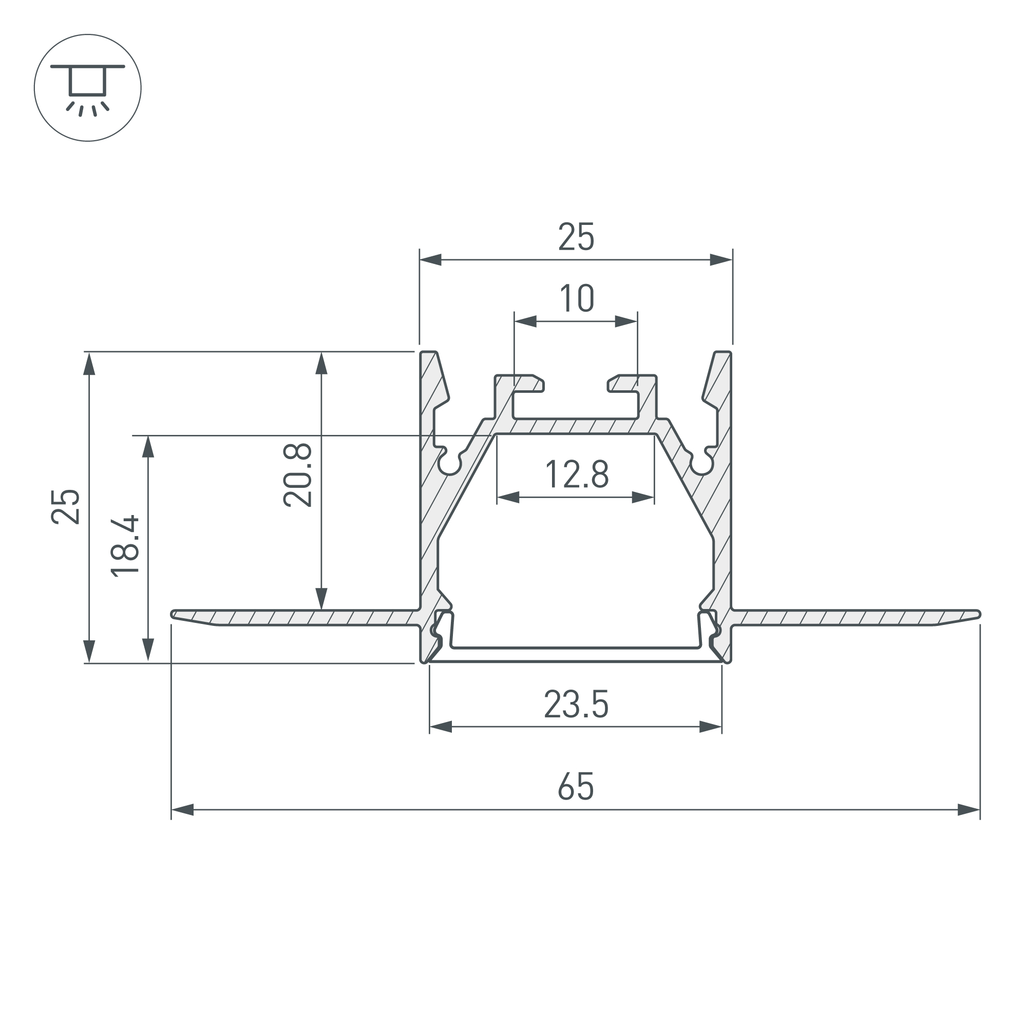 Алюминиевый анодированный профиль для светодиодных лент и линеек. Скрытая установка (под строительную отделку). Цвет - серебристый. Габаритные размеры (L×W×H): 2000x65x25 мм. Ширина площадки для ленты 12,8 мм. Экраны, заглушки и другие аксессуары приобретаются отдельно. Цена за 1 метр.