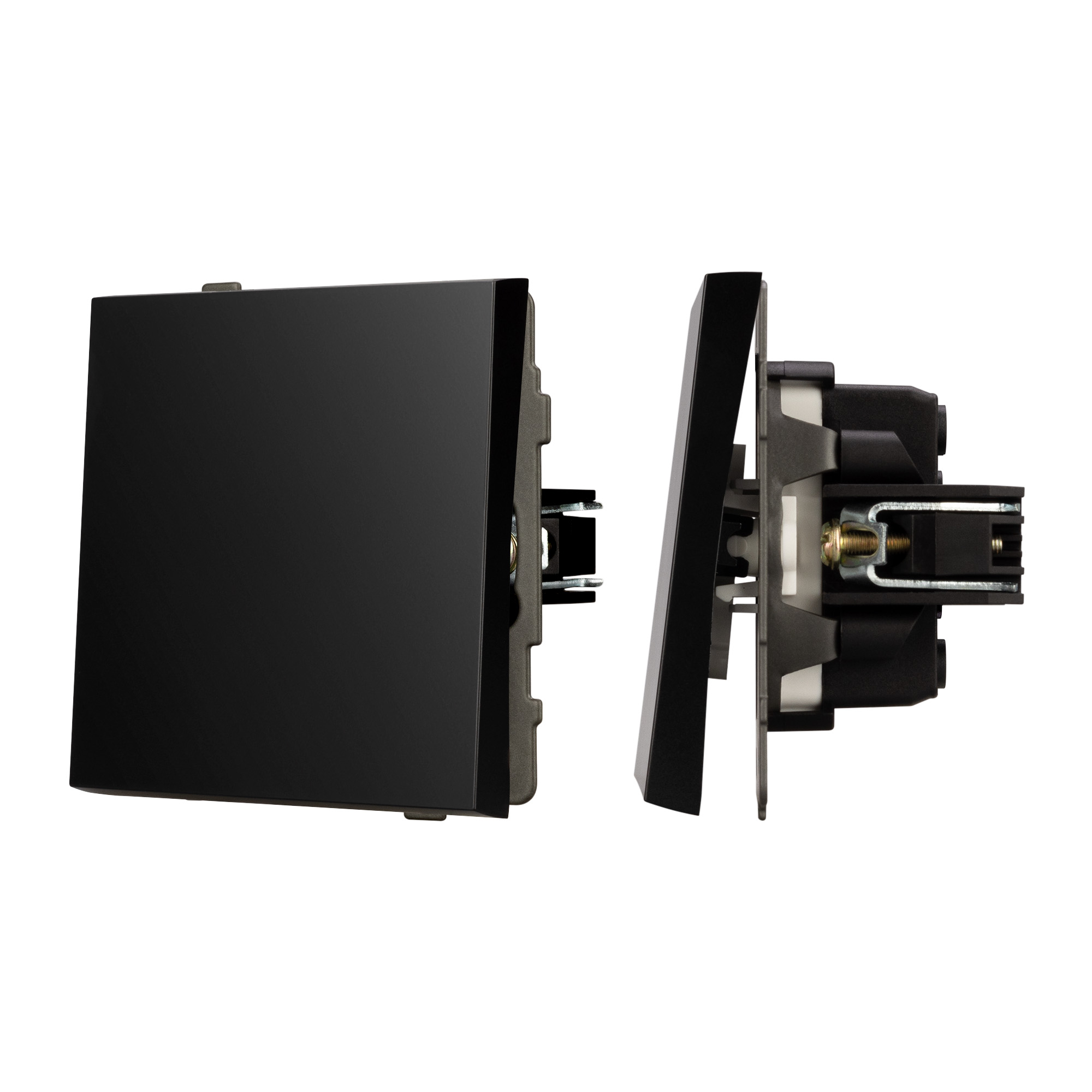 Контактная часть присоединяется при помощи винтовых зажимов, позволяя надежно подсоединить механизм выключателя к питающим элементам. А усиленные распорные лапки двойного захвата надежно фиксируют механизм в установочном подрозетнике круглого сечения диаметром 60мм.