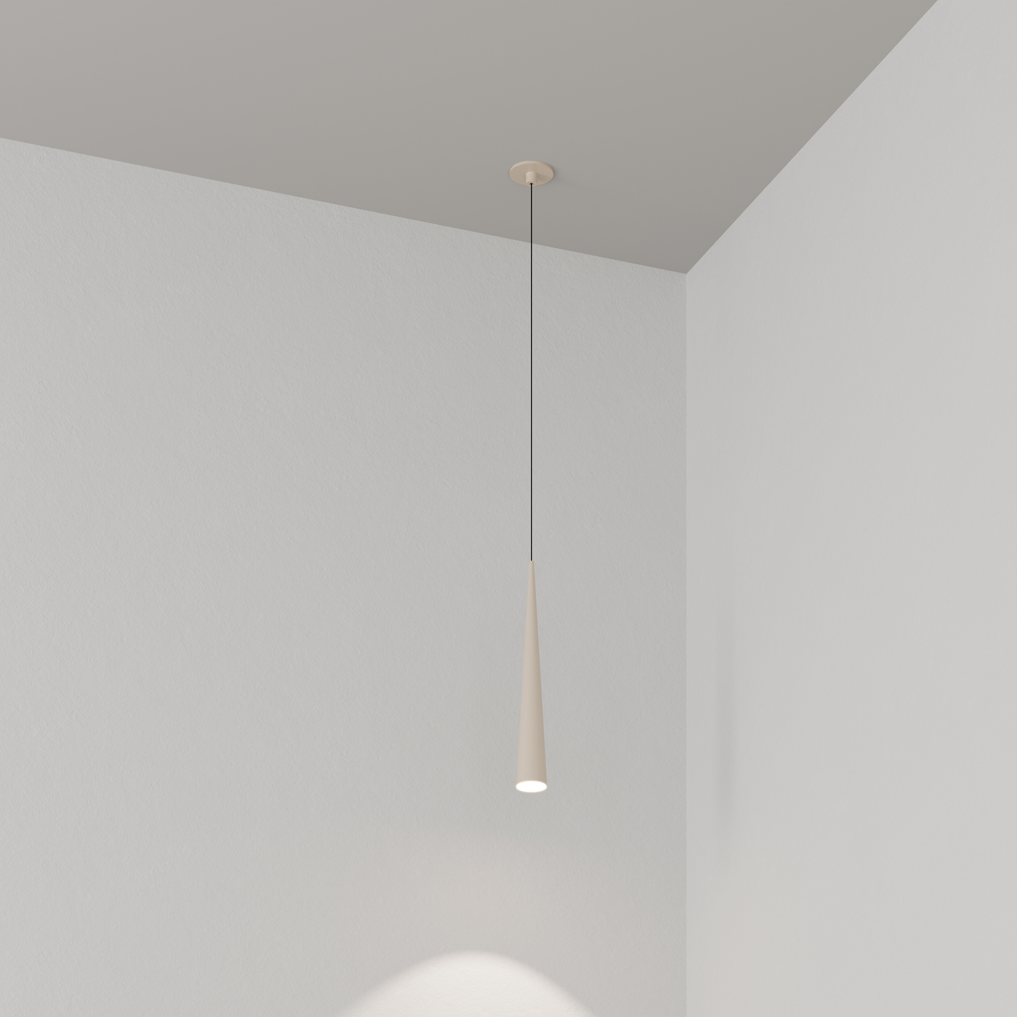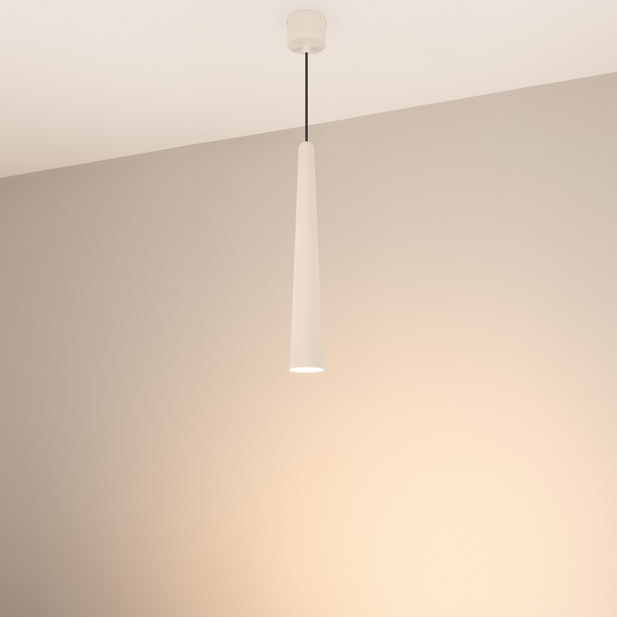 Подвесной светильник. Мощность 5 Вт, св. поток 400 лм, световая эффективность 70 лм/Вт, теплый 2700 K, CRI>92, угол 36°, напряжение питания 230 В. Кремовый конусообразный вытянутый корпус из алюминия, линза из PMMA, степень защиты IP20. Размер: диаметр 57 мм, высота 400 мм. Монтаж подвесной, длина подвеса 2000 мм, регулируемая. В комплекте 2 вида чаш. Габариты встраиваемой чаши: Ø 80x41 мм. Габариты накладной чаши Ø80x60 мм. Драйвер 2,8-12В, 500 мА, пульсация <1%.