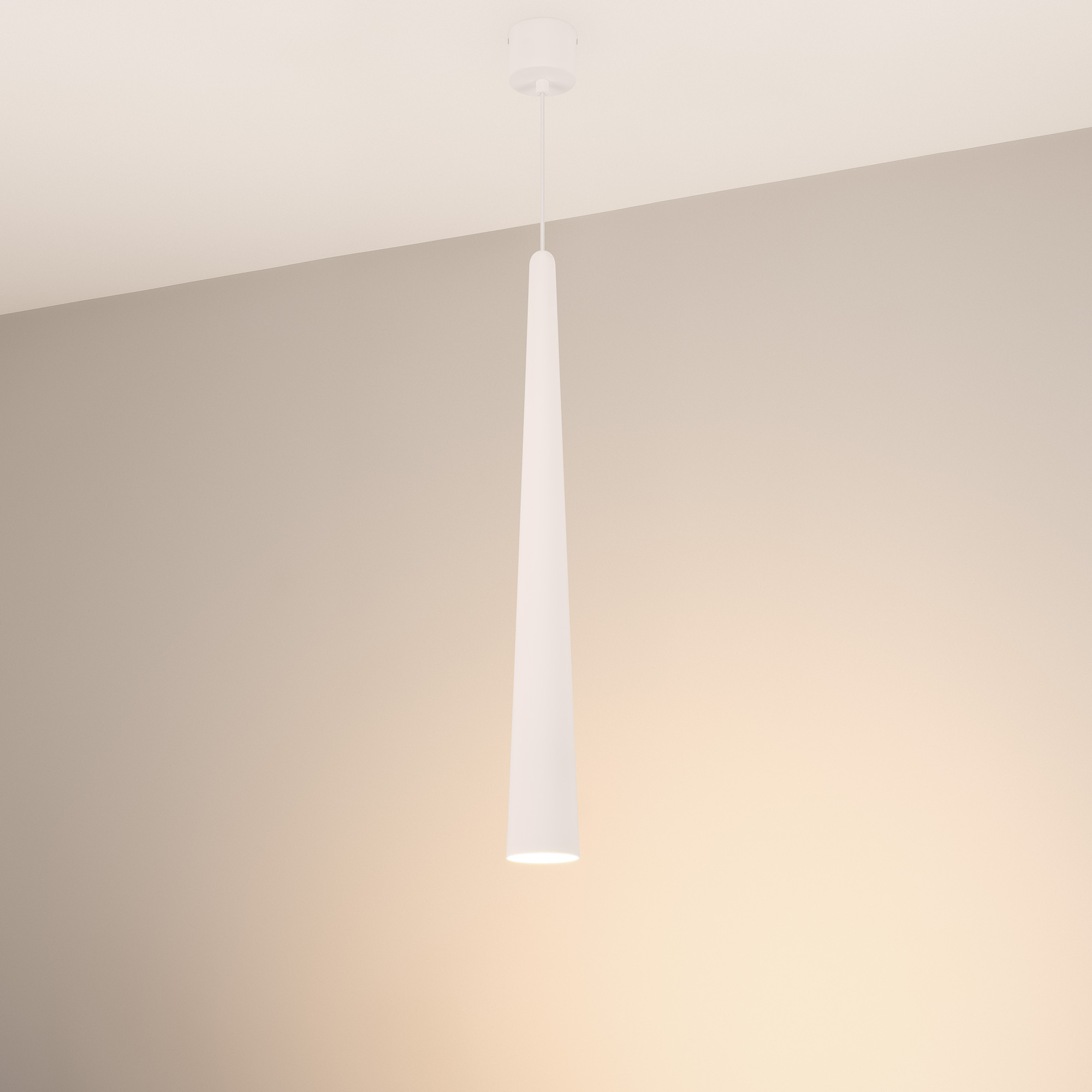 Подвесной светильник. Мощность 5 Вт, св. поток 400 лм, 70 лм/Вт, теплый 3000K, CRI>92, угол 36°, напряжение питания 230 В. Белый конусообразный вытянутый корпус из алюминия, линза из PMMA, степень защиты IP20. Размер: диаметр 76 мм, высота 670 мм. Монтаж подвесной, длина подвеса 2000 мм, регулируемая. В комплекте 2 вида чаш. Габариты встраиваемой чаши: Ø 80x41 мм. Габариты накладной чаши Ø80x60 мм. Драйвер 2,8-12В, 500 мА, пульсация <1%.