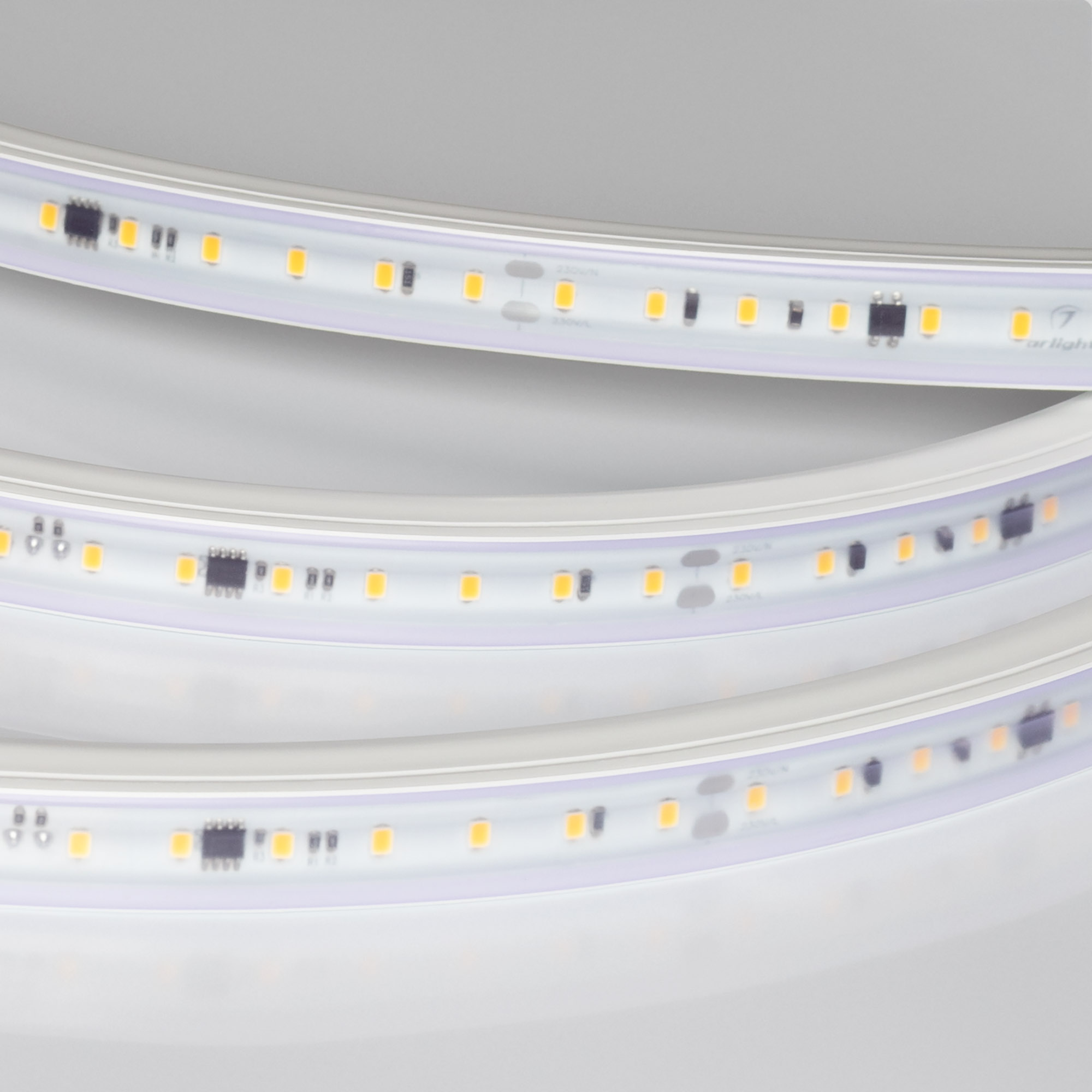 Светодиодная герметичная лента ARL серии A84 со степенью защиты IP65, защитная оболочка из ПВХ устойчива к УФ излучению. Высокий индекс цветопередачи CRI>85 обеспечивает точное восприятие цветовых оттенков. Лента подключается непосредственно к сети переменного тока 230 В и не требует использования источников питания. Наличие интегральных стабилизаторов тока позволяет подключать ленту длиной до 10 м, обеспечивая при этом равномерную яркость свечения по всей длине ленты. При подключении нескольких лент необходимо подавать питание на каждые 10 м отдельным кабелем, последовательное подключение лент более 10 м запрещается. Лента применяется для декоративной подсветки помещений, потолочных ниш, создания контуров рекламных объектов внутри помещений. Ленты обладают низким коэффициентом пульсаций FlickerFree <2%. Для расчета потребляемой мощности необходимо учитывать коэффициент мощности - PF>0.75. На лентах установлены микросхемы с функцией снижения тока для защиты ленты от перегрева, обеспечивающие надежную работу в различных условиях. Диммирование в диапазоне 30%-90% осуществляется TRIAC диммерами с установкой минимального уровня яркости, при диммировании коэффициент пульсаций увеличивается. Крепление с помощью скоб, аксессуары для монтажа и подключения поставляются отдельно.
