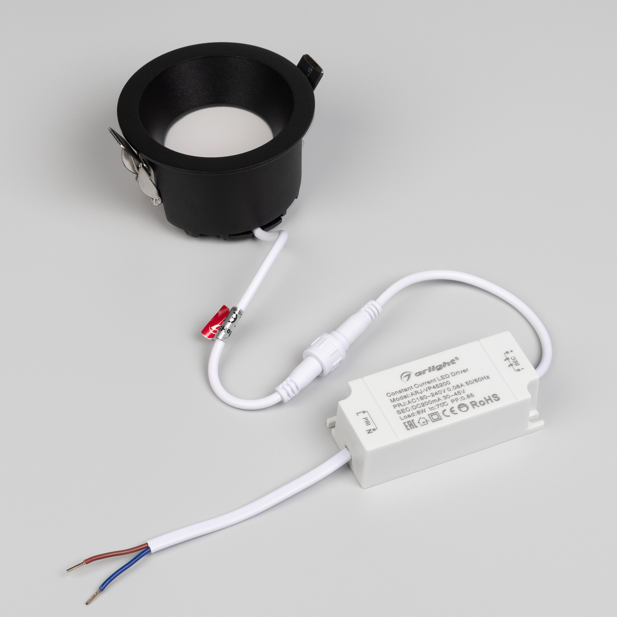 Встраиваемый светильник даунлайт. Мощность 8 Вт, св. поток 610 лм, 76 лм/Вт, тёплый 2700 K, CRI>90, угол 85°, напряжение питания 230 В. Чёрный круглый корпус из алюминия, степень защиты IP54. Размер: диаметр 84 мм, высота 49 мм. Монтаж встраиваемый, установочное отверстие: диаметр 75 мм. Драйвер 30-45 В, 200 мА, пульсация <3%.