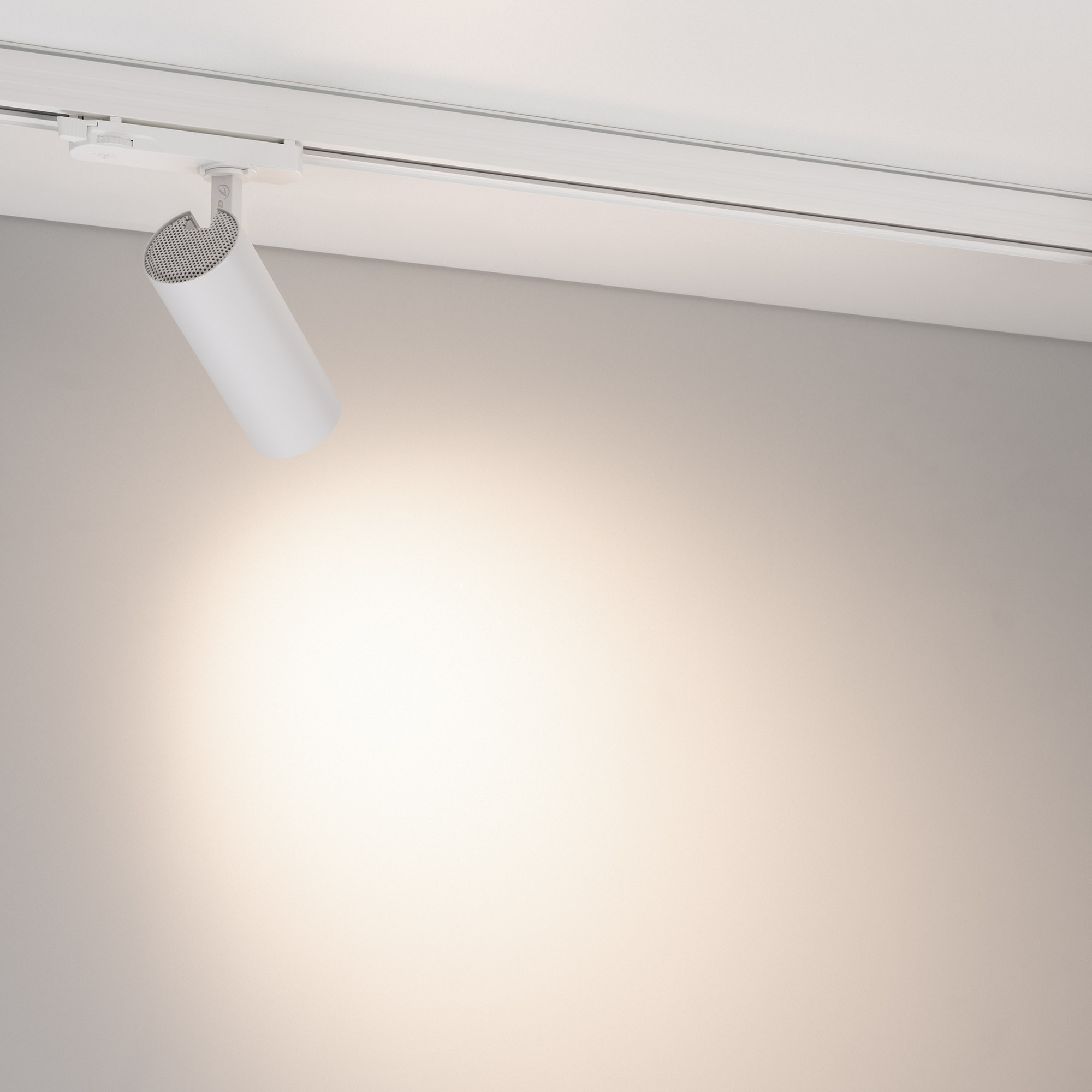Светильник для треков/шин 4 провода. Мощность 10 Вт, св. поток без решетки honeycomb 1000 лм, 100 лм/Вт, с решеткой honeycomb 660 лм, 66 лм/Вт, дневной 4000 K, CRI>90, угол 55°, напряжение питания 230 В. Белый круглый корпус из алюминия, материал линзы PMMA, степень защиты IP20. Антибликовая решетка honeycomb в комплекте. Размер: диаметр 55 мм, длина световой части 141 мм. Монтаж на трек 3-фазный. Драйвер встроенный 24-42 В, 250мА., пульсация <5%.