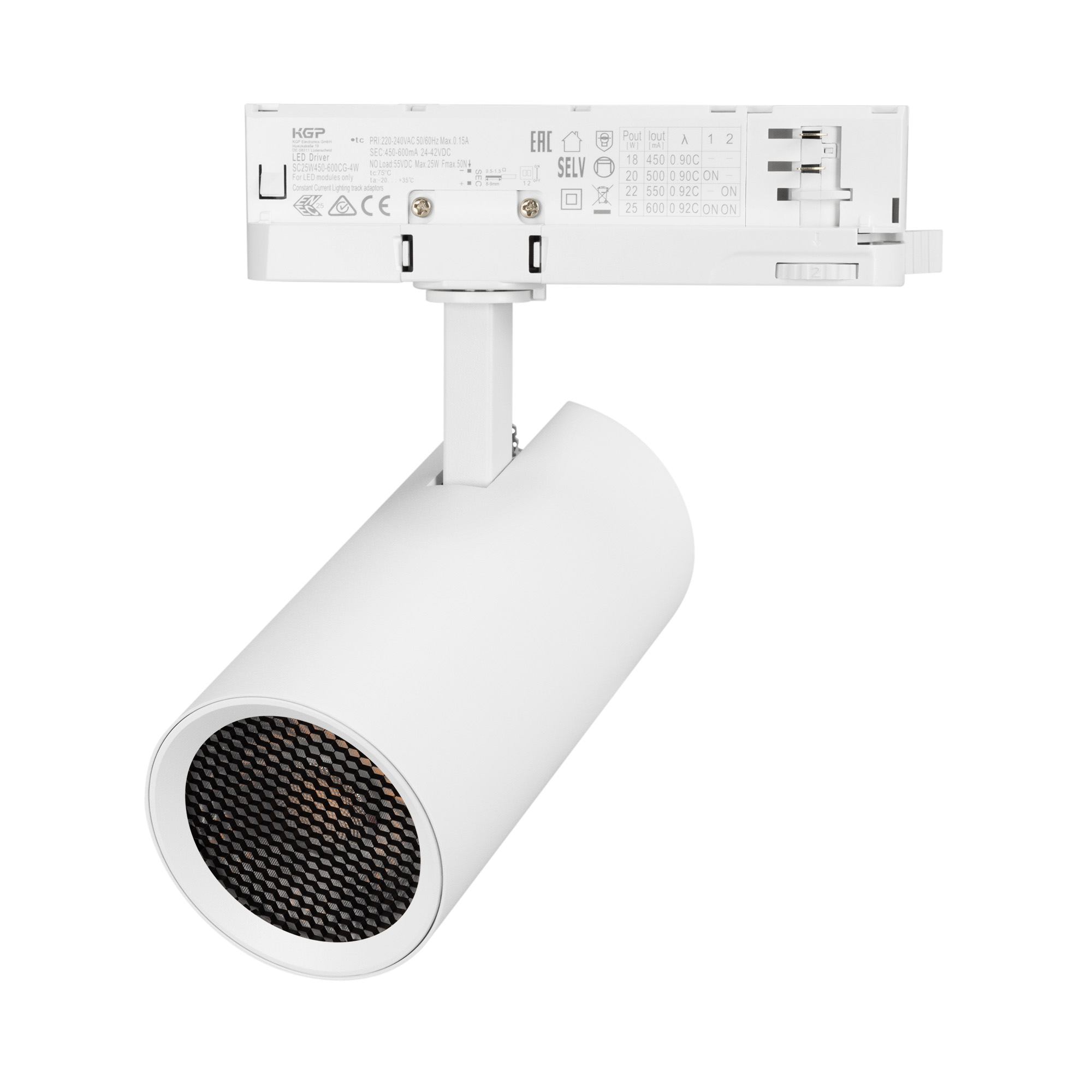 Одинарный трековый светильник GERA мощностью 20 Вт с дневным цветом свечения (4000 К) и индексом цветопередачи CRI>90 для создания локального направленного освещения в квартирах, офисах, музеях, магазинах и др. помещениях. Светильник с узким углом рассеивания 55 градусов и световым потоком 2000 лм обеспечивает качественное освещение и высокую световую отдачу, оснащен решеткой HONEYCOMB в комплекте. Стильный лаконичный корпус из алюминия окрашен в белый цвет высококачественной порошковой краской. Корпус светильника поворачивается вокруг своей оси, что позволяет быстро менять направление светового луча. Светильник легко устанавливается в трехфазный трек серии LGD и подключается к сети переменного тока 230 В с помощью встроенного драйвера. Дополнительные аксессуары приобретаются отдельно.