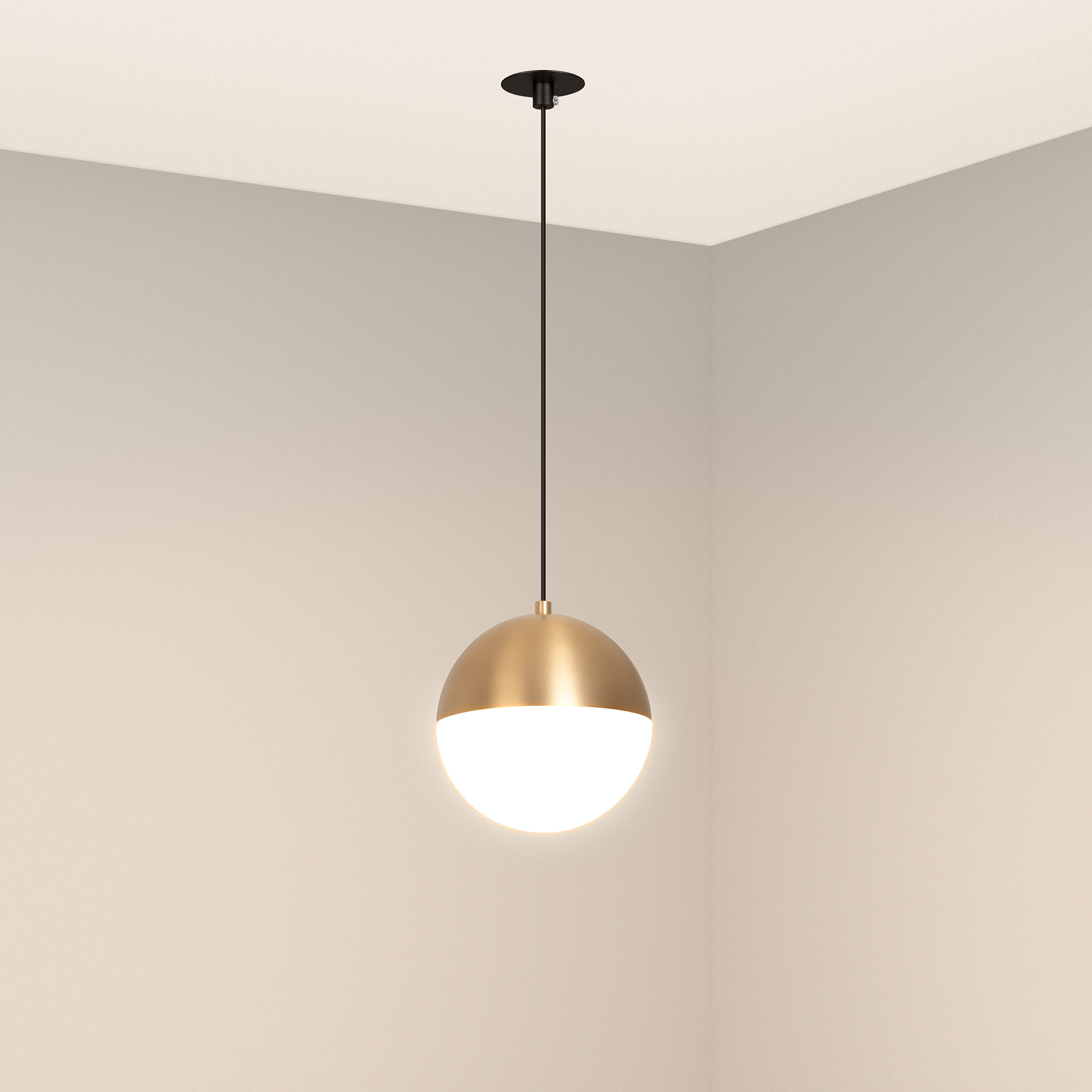 Светильник подвесной. Мощность 11 Вт, св. поток 960 лм, 80 лм/Вт, дневной 4000 K, CRI>90, угол 170°, напряжение питания 230 В. Золотой корпус из алюминия, материал плафона стекло, степень защиты IP20. Размер: диаметр 150 мм, длина подвеса 1500 мм. Потолочная чаша встраиваемая, черного цвета. Размеры Ø 60x40 мм. Размер врезного отверстия Ø 50 мм. Драйвер 28-42 В, 250 мА, пульсация <1%.