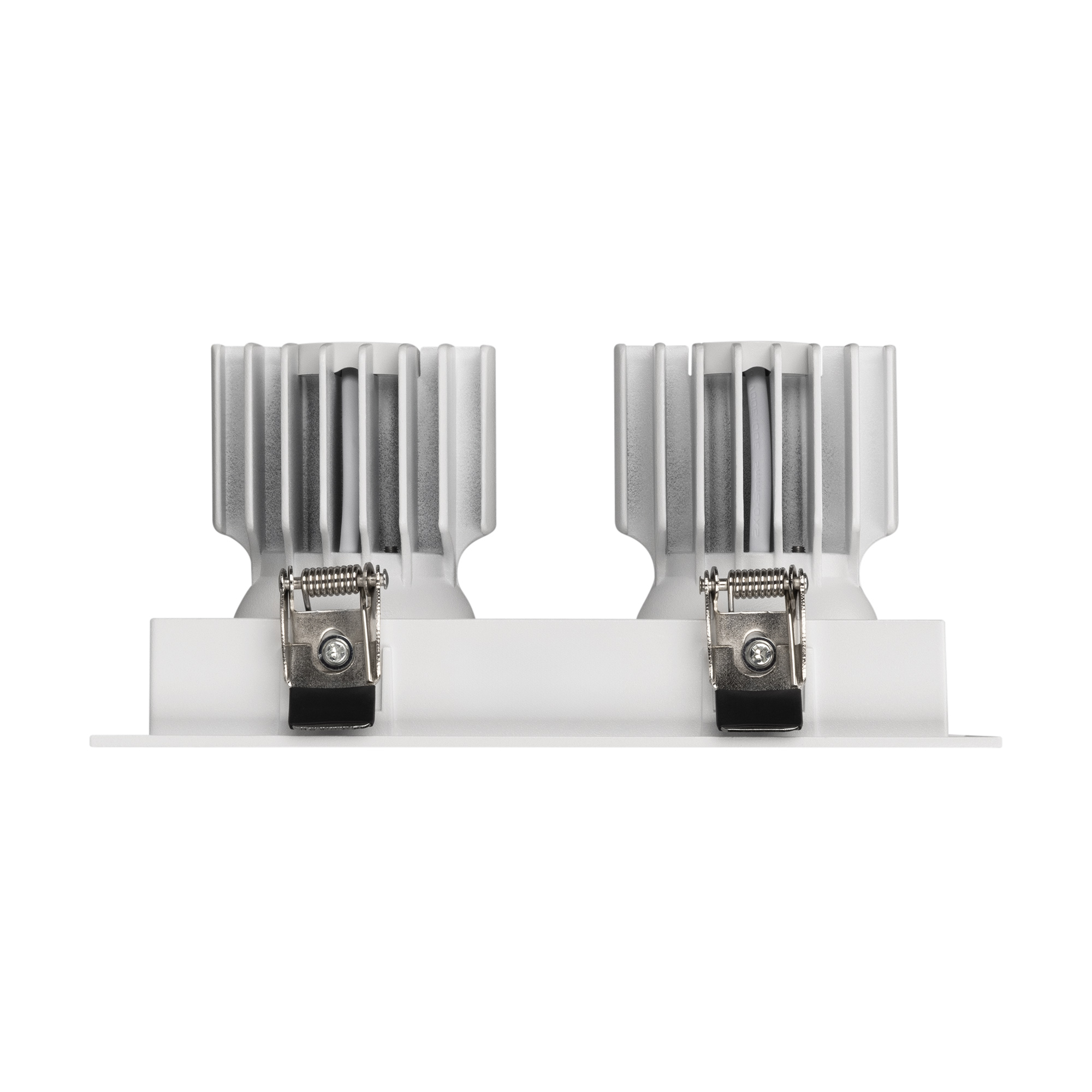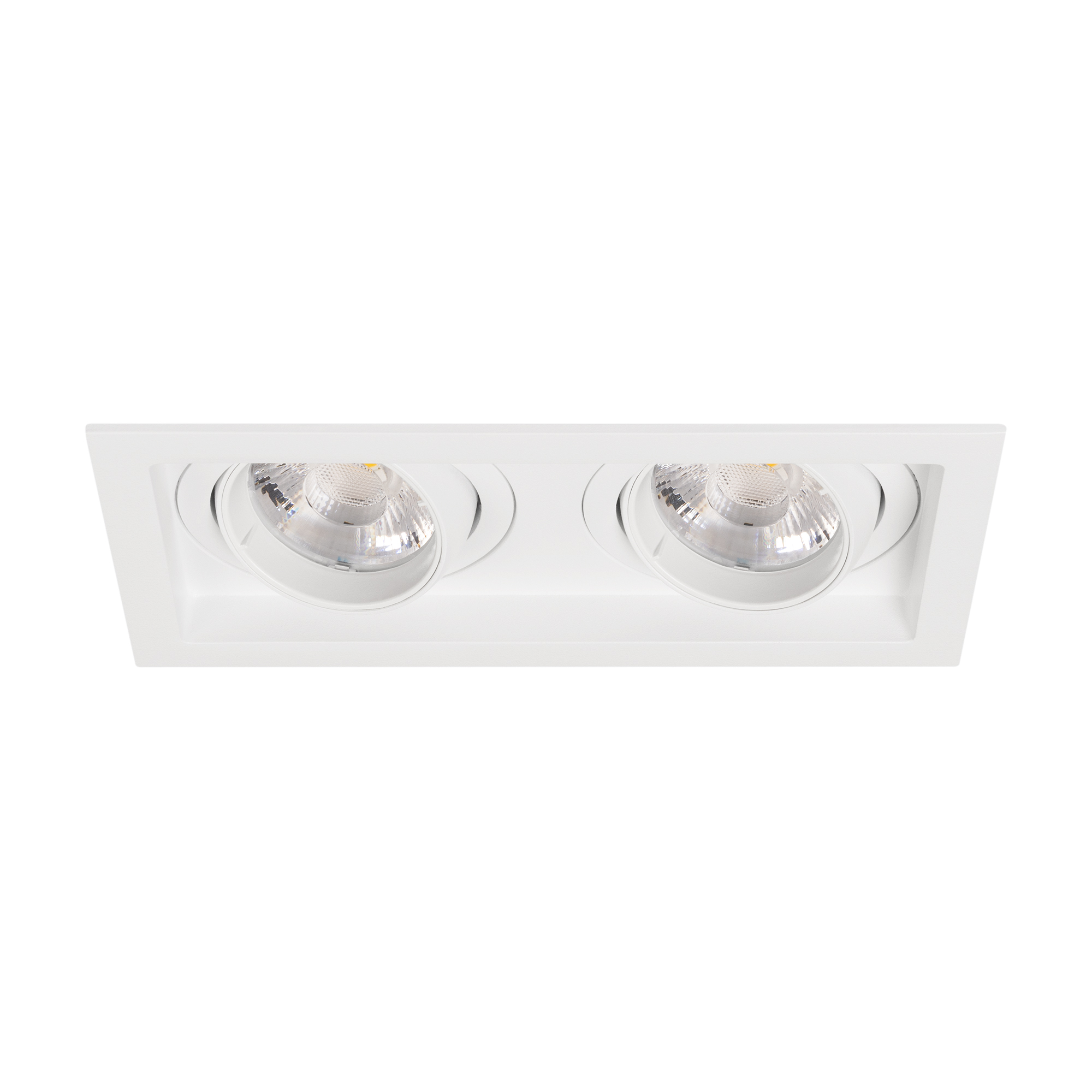 Встраиваемый карданный светильник. Мощность 2х12 Вт, св. поток 2636 лм, 109 лм/Вт, тёплый 3000 K, CRI>92, угол 20°, напряжение питания 230 В. Белый корпус из алюминия, белая вставка, степень защиты IP20. Размер: длина 170 мм, ширина 90 мм, высота 80 мм. Монтаж встраиваемый, установочное отверстие: длина 155 мм, ширина 75 мм. Драйвер 27-40 В, 300 мА, пульсация <2%.