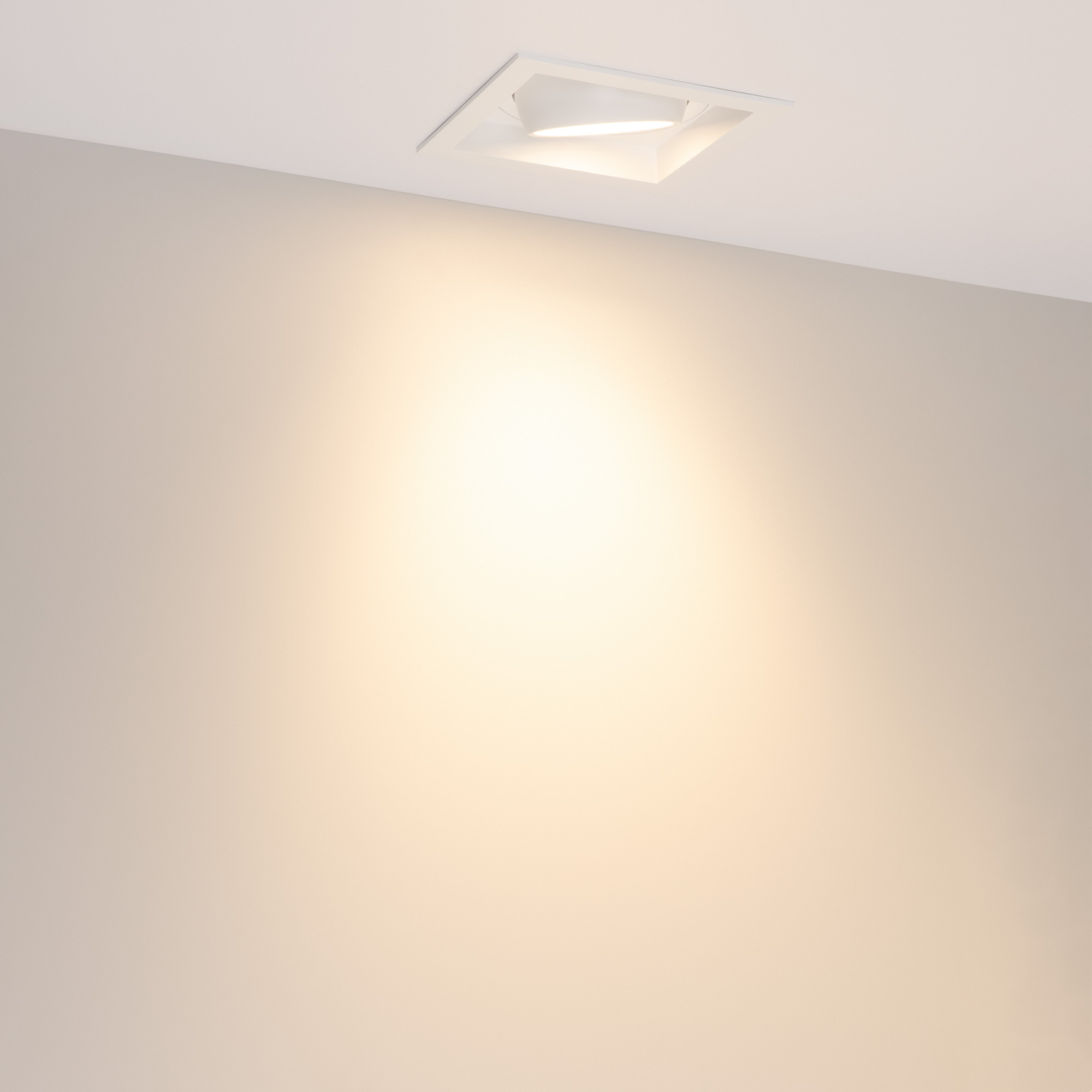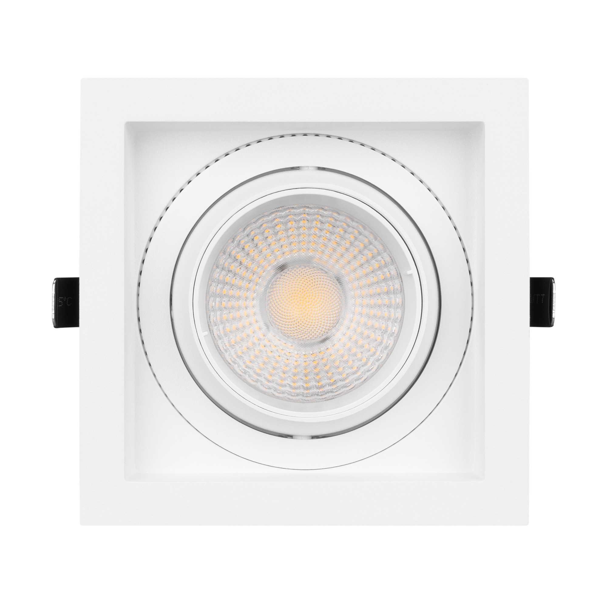 Встраиваемый карданный светильник. Мощность 30 Вт, св. поток 2650 лм, 88 лм/Вт, тёплый 3000 K, CRI>92, угол 50°, напряжение питания 230 В. Белый корпус из алюминия, белая вставка, степень защиты IP20. Размер: длина 140 мм, ширина 140 мм, высота 125 мм. Монтаж встраиваемый, установочное отверстие: длина 120 мм, ширина 120 мм. Драйвер 24-42 В, 750 мА, пульсация <2%.