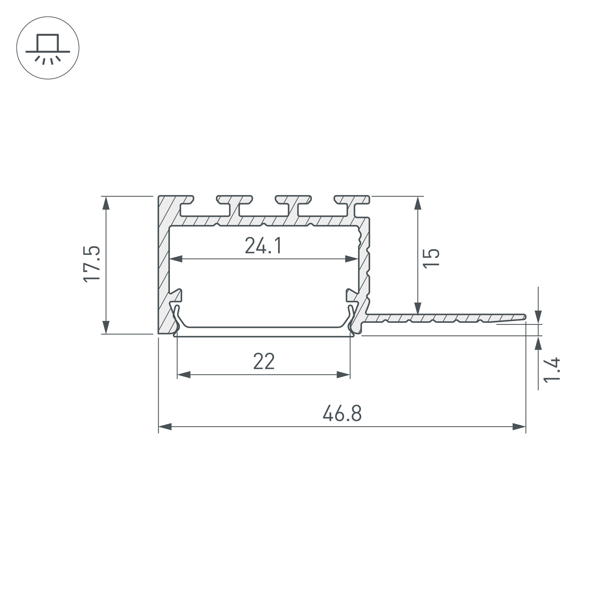 Габаритные размеры профиля составляют 2000 мм в длину, 46,8 мм в ширину и 17,5 мм в высоту. Площадка для установки светодиодных лент позволяет использовать ленту шириной до 24 мм и мощностью до 19,2 Вт/м. Это обеспечивает гибкость в выборе светодиодных лент и создает потрясающие световые решения.