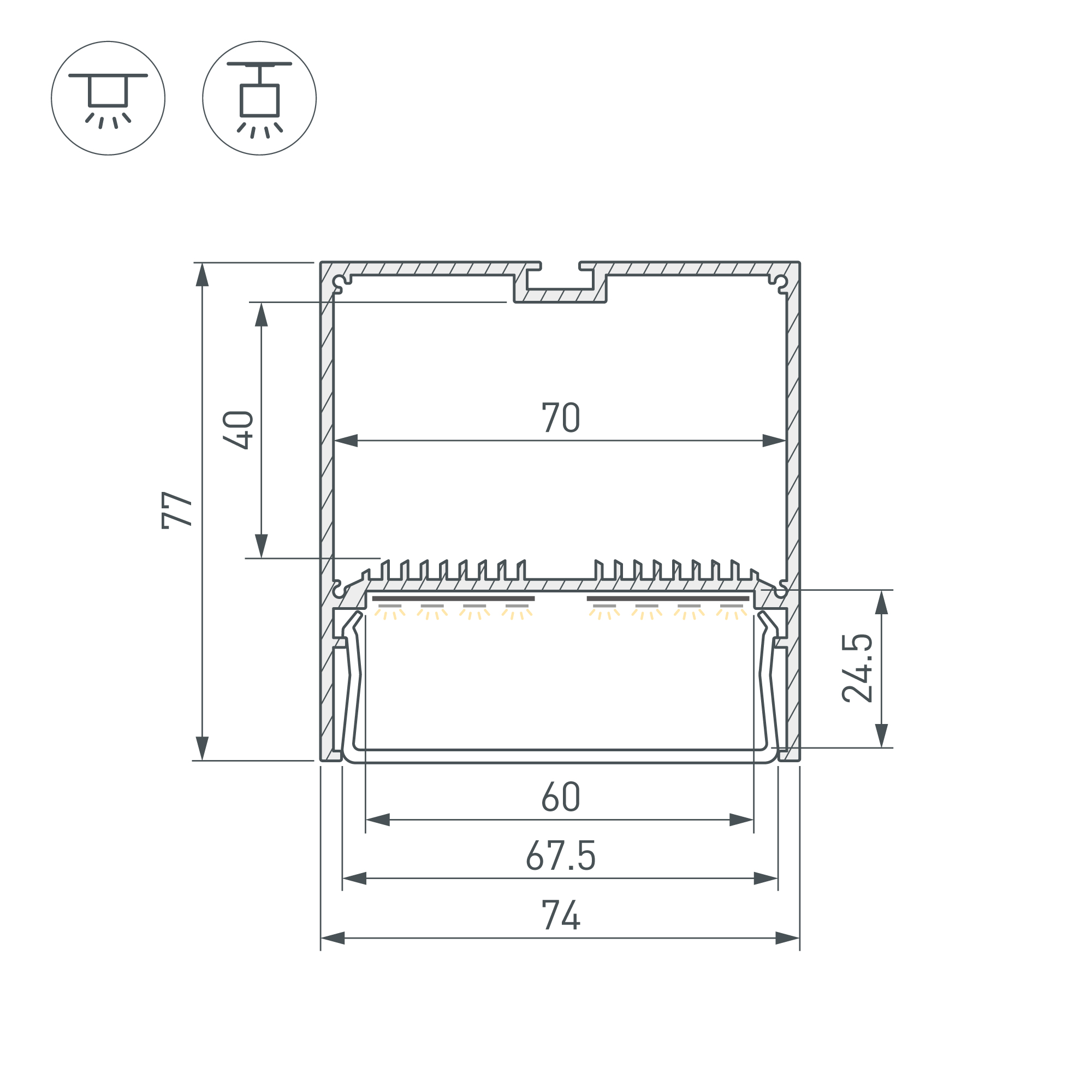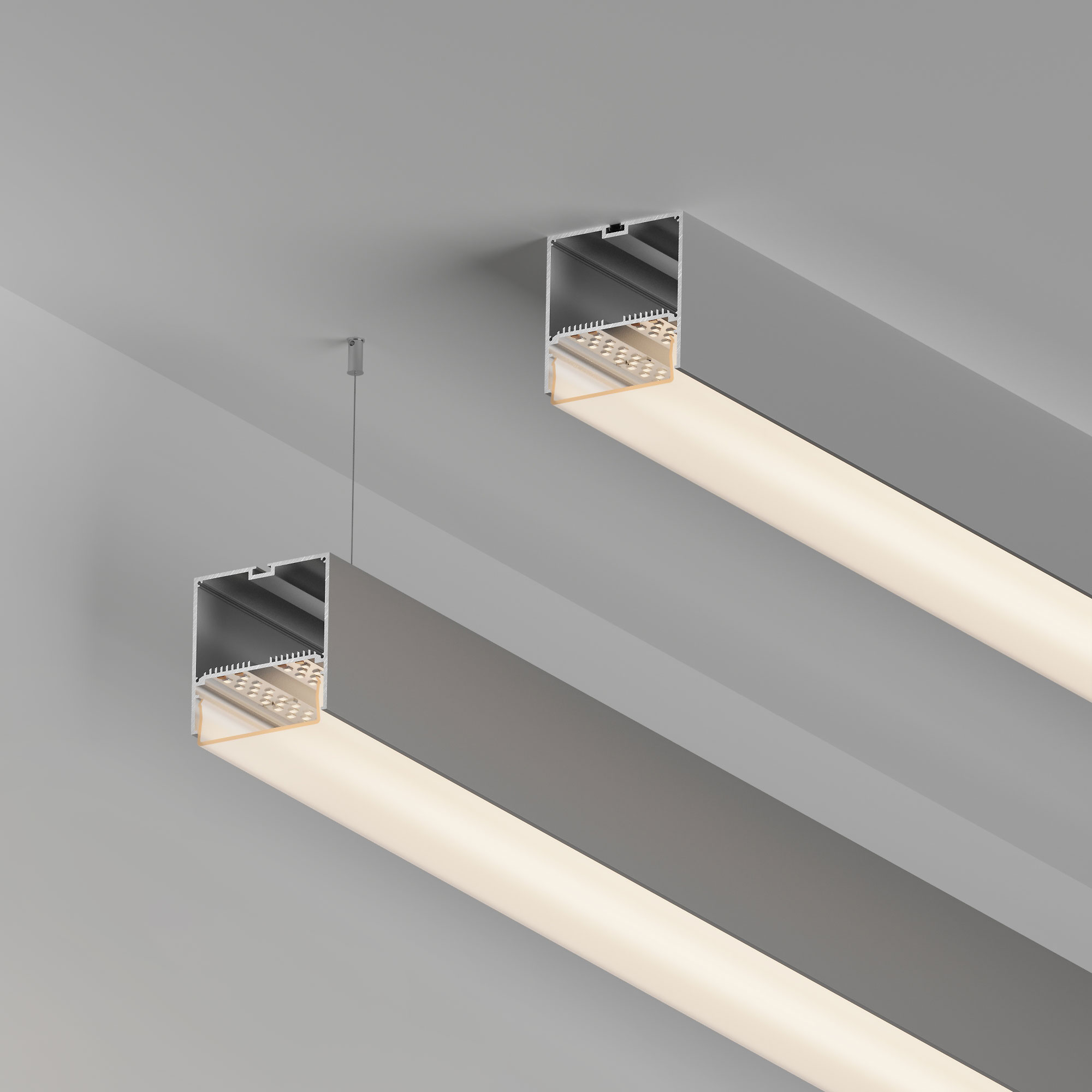 Подвесной/накладной профиль из анодированного алюминия для основной и контурной подсветки помещений. Габаритные размеры профиля составляют 2000 мм в длину, 74 мм в ширину и 77 мм в высоту. Площадка для установки светодиодных лент позволяет использовать ленту шириной до 60 мм и мощностью до 79,2 Вт/м. Это обеспечивает гибкость в выборе светодиодных лент и создает потрясающие световые решения. Монтаж осуществляется накладным либо подвесным способом.