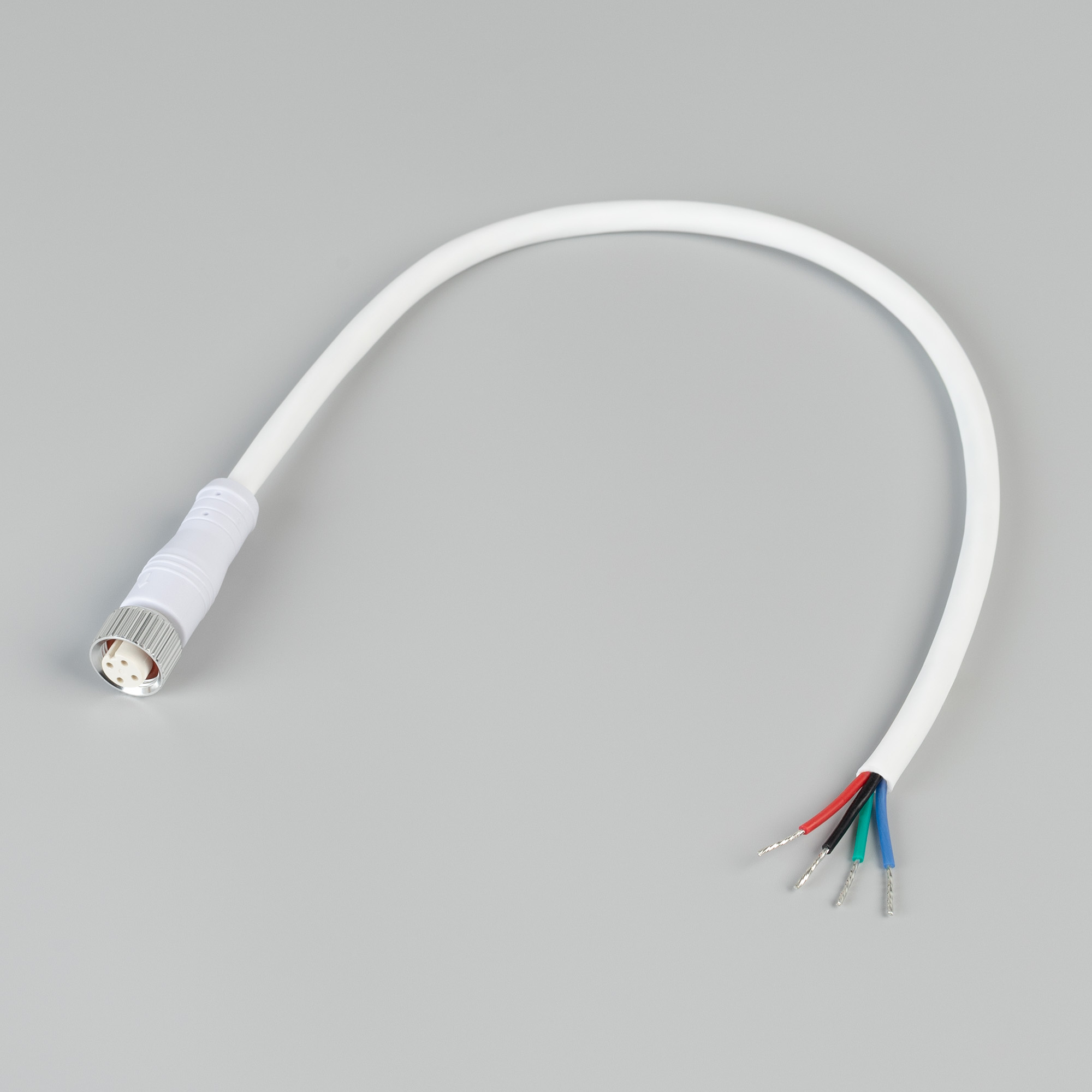 Герметичный Female (мама) коннектор питания на проводе для RGB герметичной ленты серии WAVE-DOUBLE 1615, обеспечивает простое и надежное подключение с уровнем пылевлагозащиты IP67. Провод имеет белую оболочку, коннектор сделан из белого пластика, и имеет габариты 250x15x15 мм.