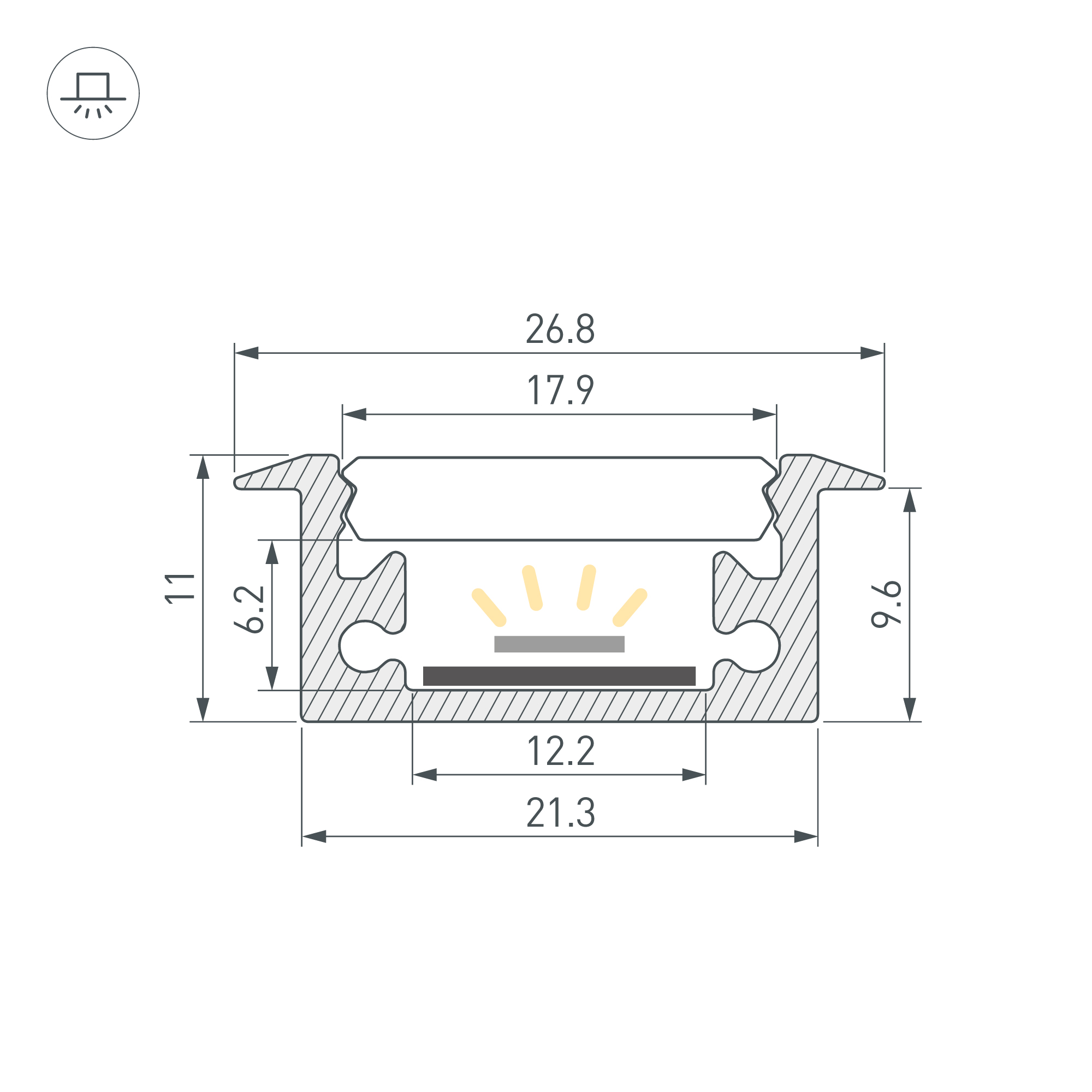 Алюминиевый анодированный профиль с фланцем. Возможность герметизации до IP65 (при использовании аксессуаров и силиконового клея для фиксации экрана и заглушек), IK10 (08-10). Габаритные размеры (L×W×H): 2000x26,8x11 мм. Ширина площадки для ленты 12,2 мм. Заглушки и другие аксессуары приобретаются отдельно. Цена за 1 метр.