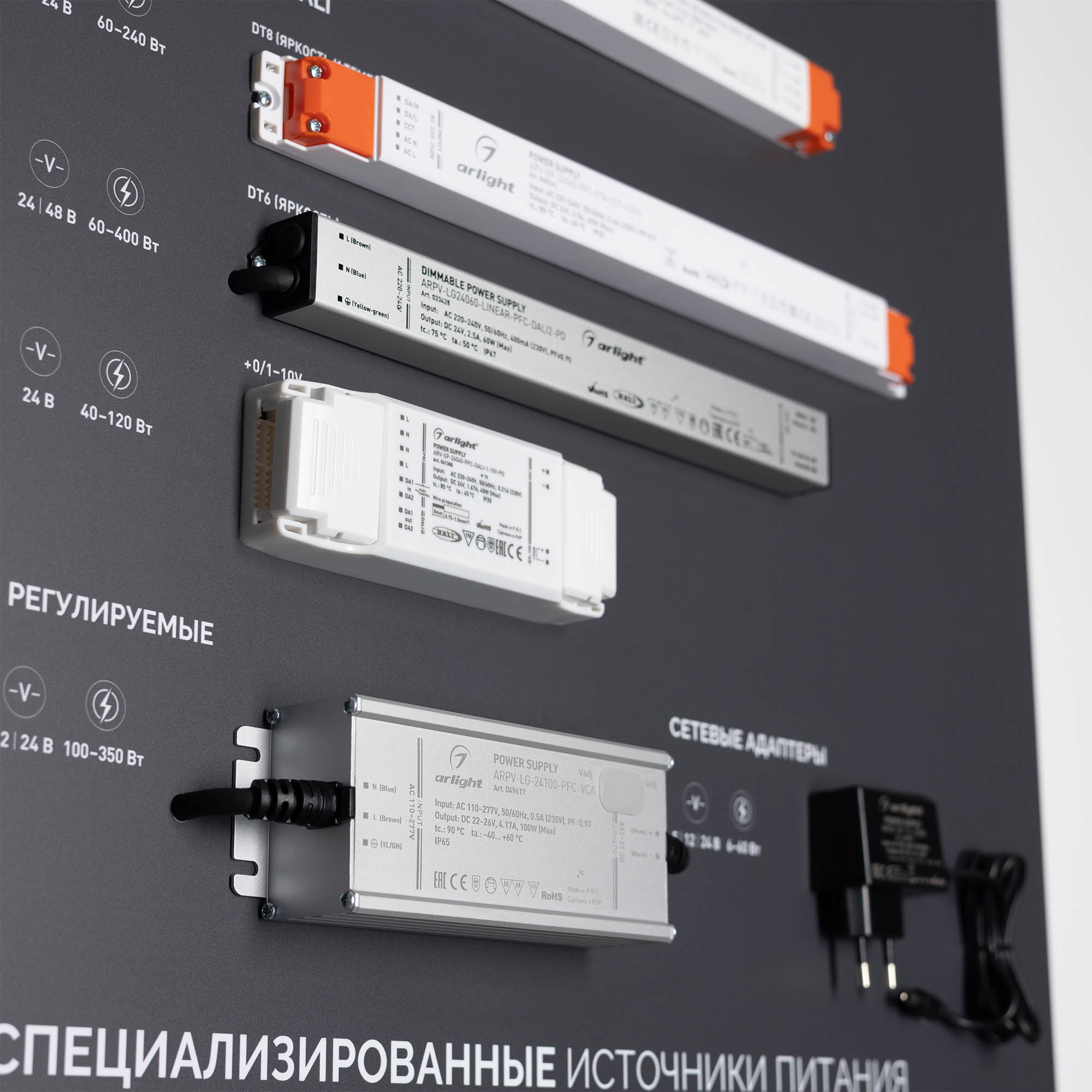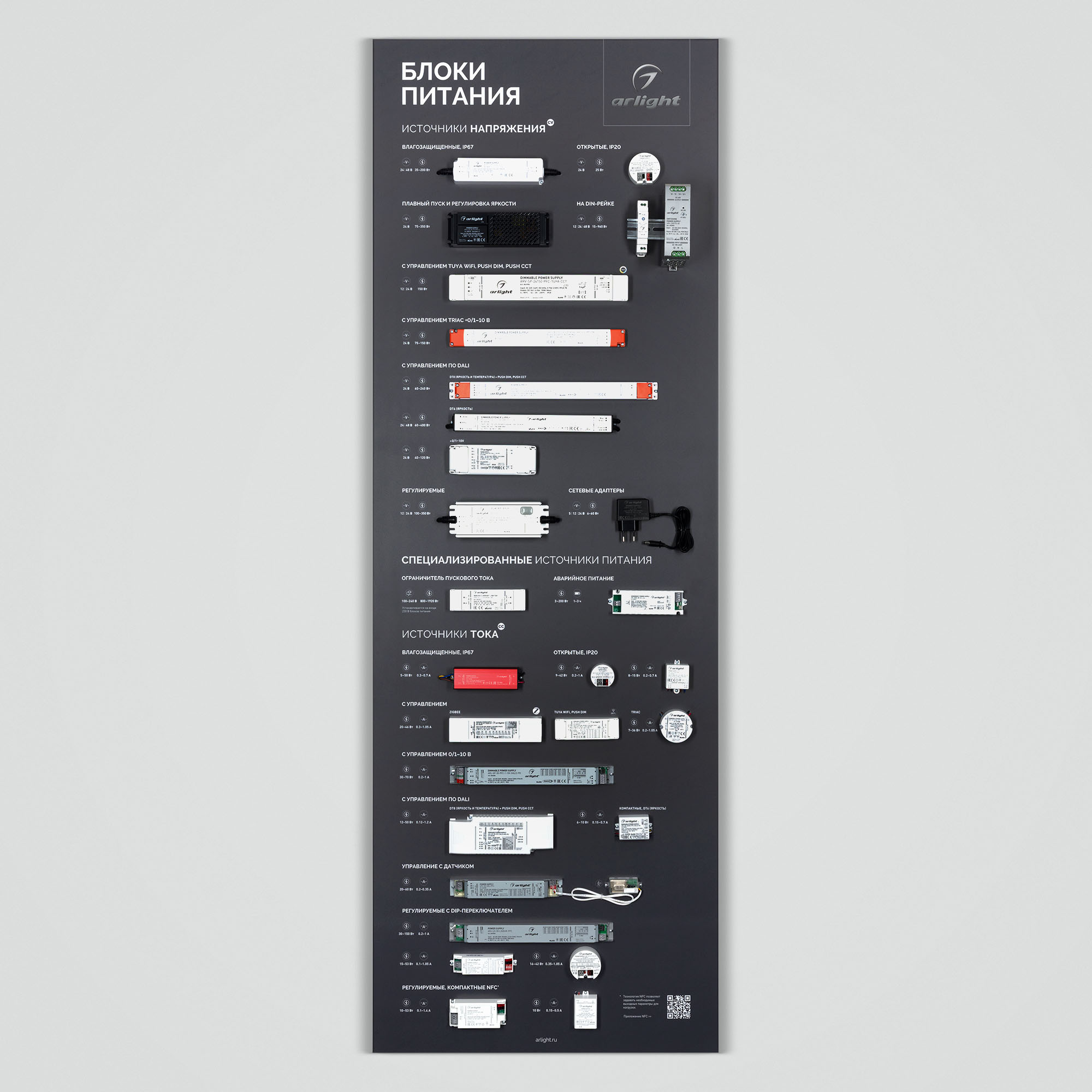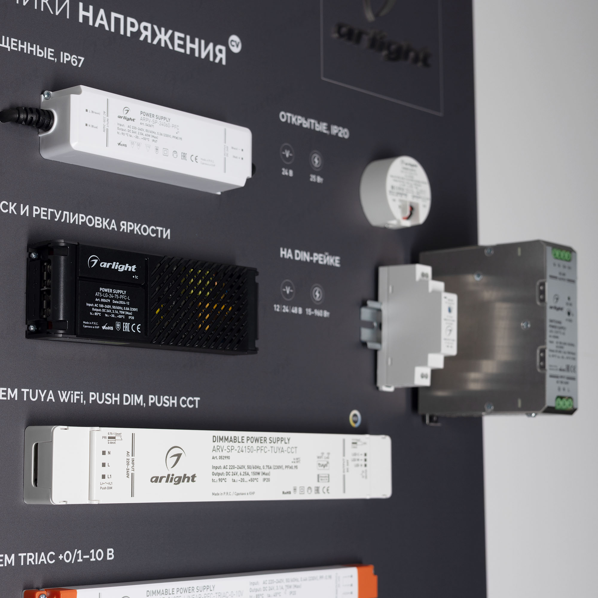 Обзорный стенд представляет ассортимент источников питания для профессионального светодиодного освещения: модели блоков питания для светодиодных лент и драйверов для светильников.